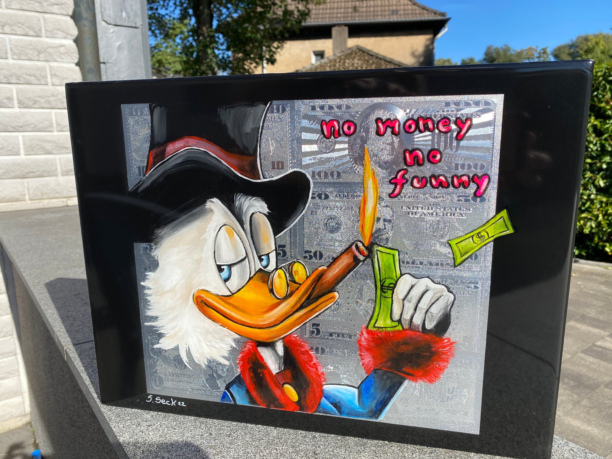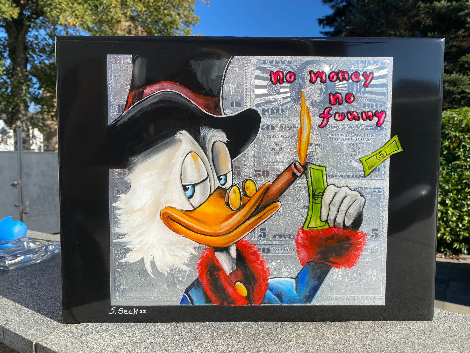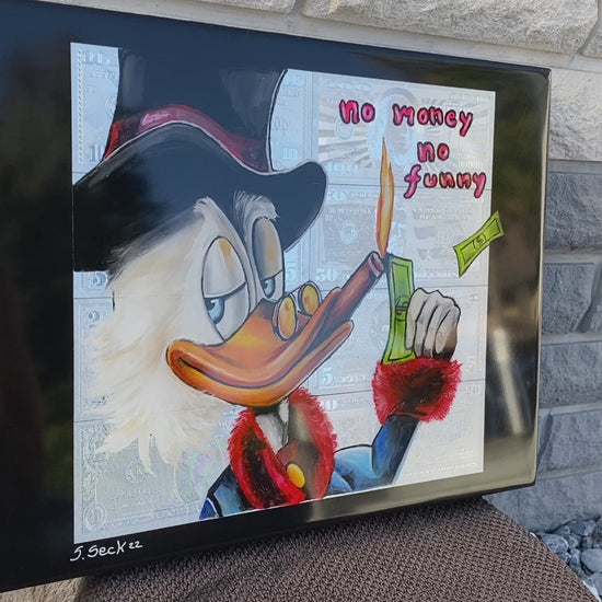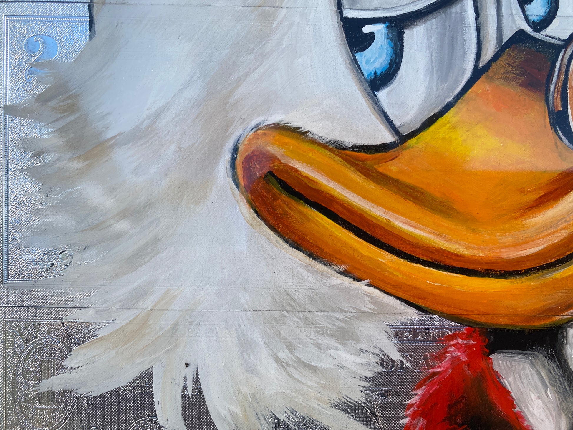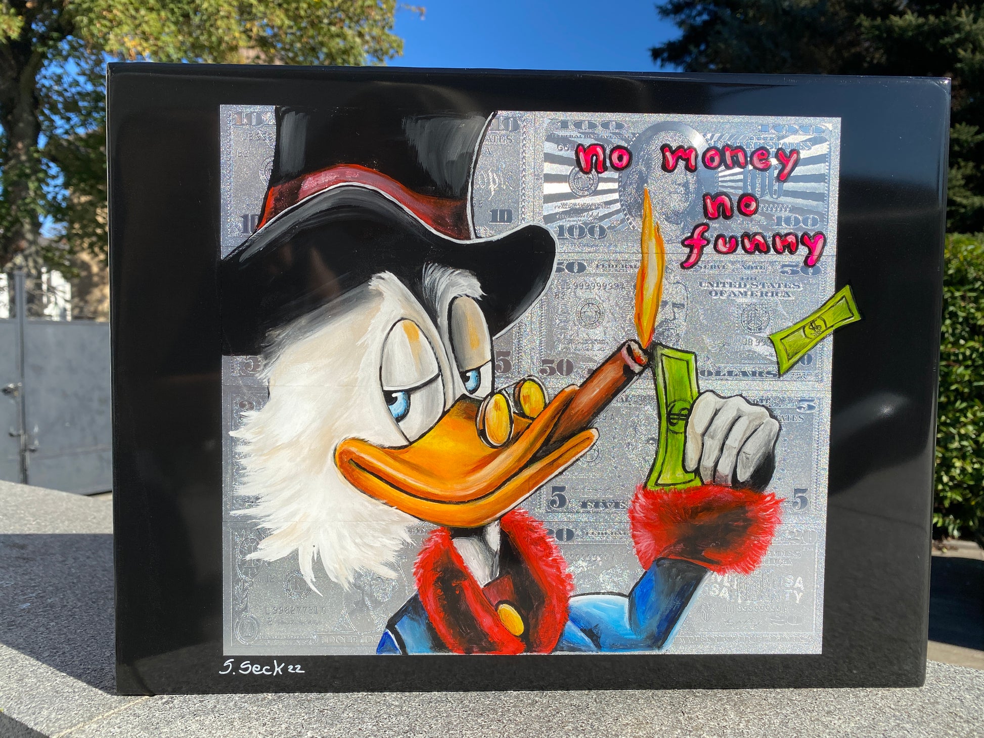 Dieses Werk wurde auf eine Holzleinwand gemalt. Der Hintergrund ist neben dem schwarz mit silbernen Dollarscheinen versehen, die je nach Lichteinfall schimmern.