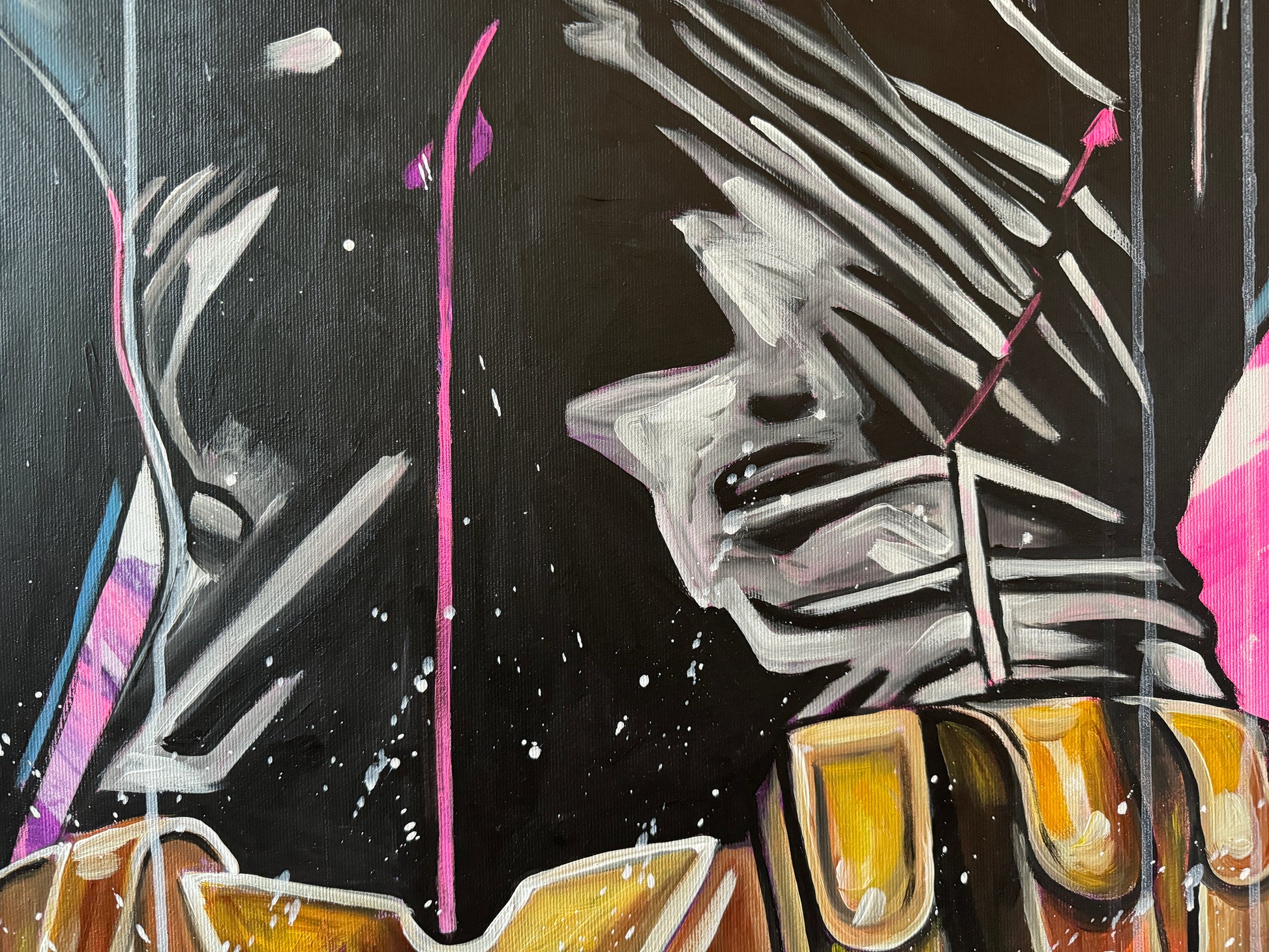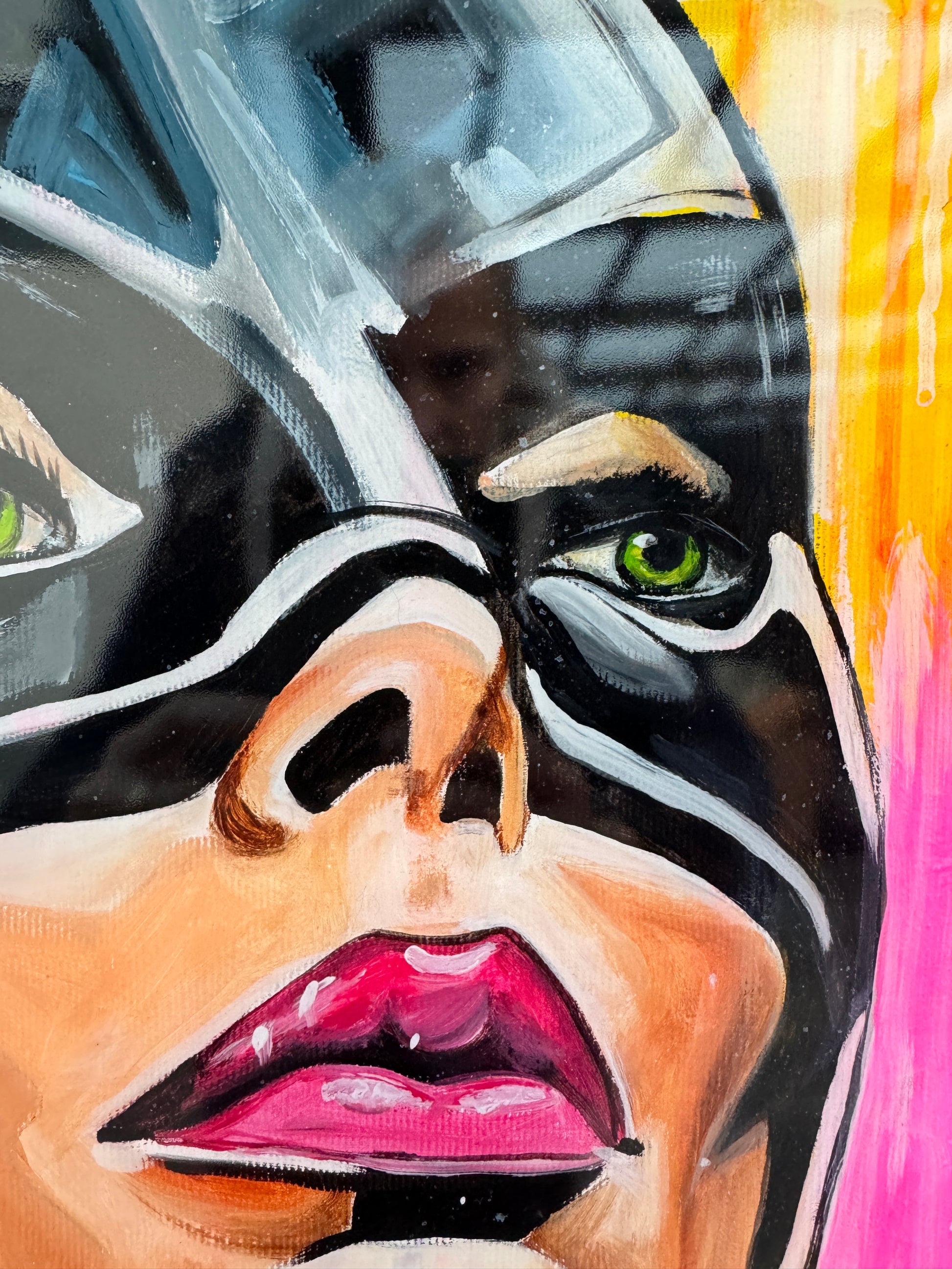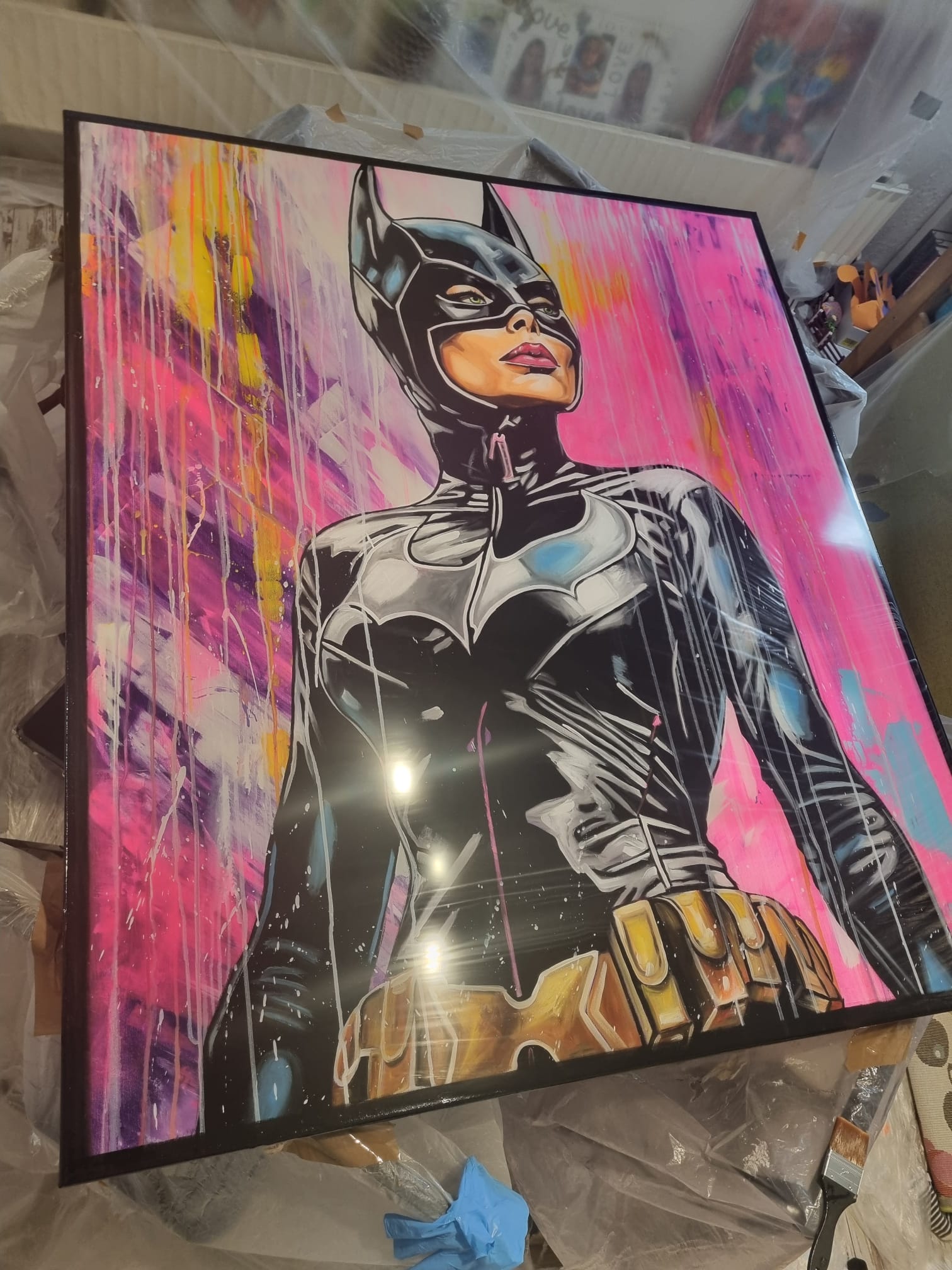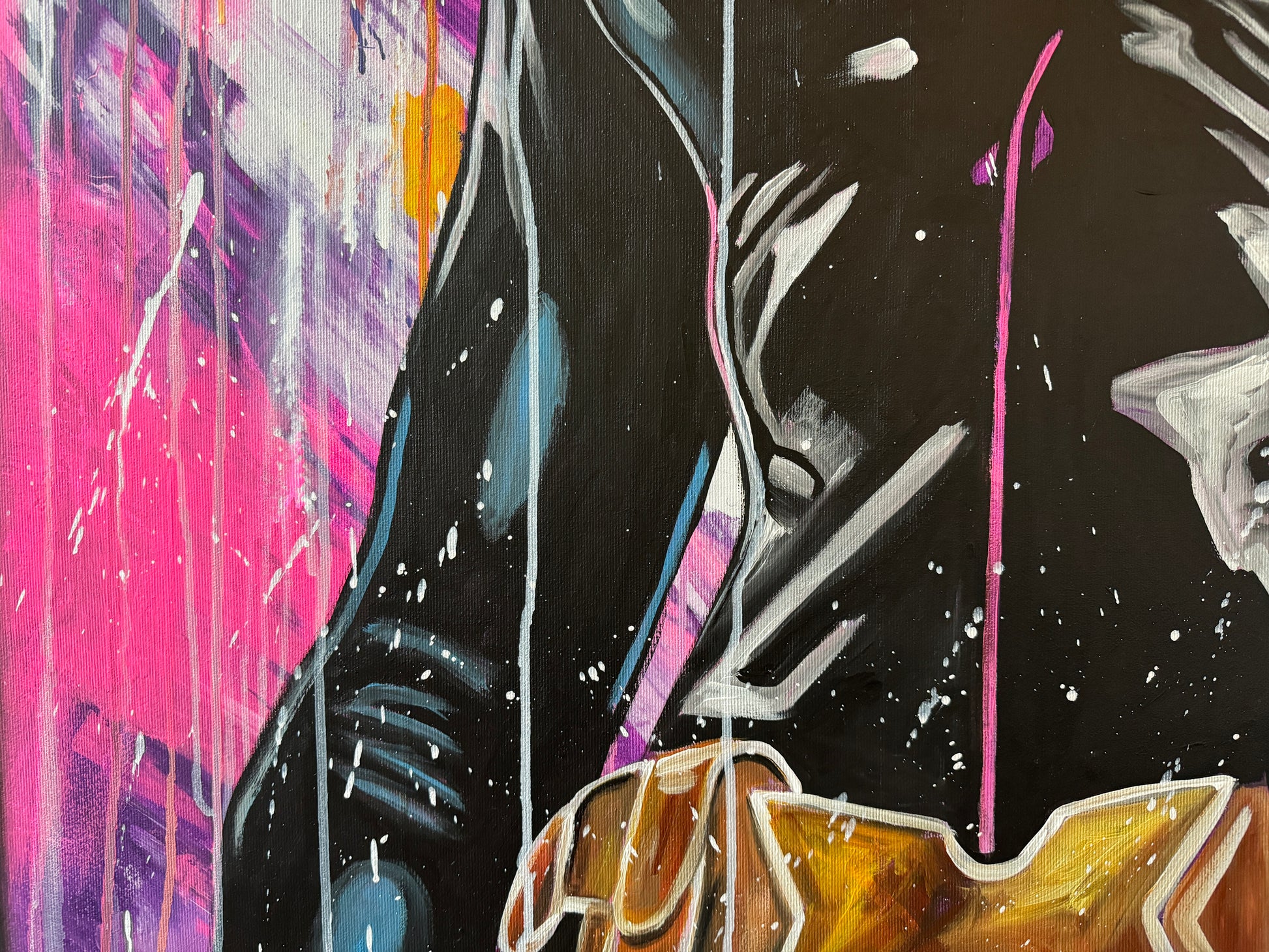 In meinem Kunstwerk habe ich die lebendigen Farben der Acrylmalerei mit der Tiefe des Harzes verbunden, um ein kräftiges, dynamisches Bild zu schaffen. Inspiriert von Comics und Pop-Art, verbindet die Darstellung ein realistisches Gefühl mit der fantastischen Welt der Figuren. Diese leuchtende Energie wird Ihrem Raum ein Gefühl von Mut und eine Atmosphäre der Faszination verleihen.
