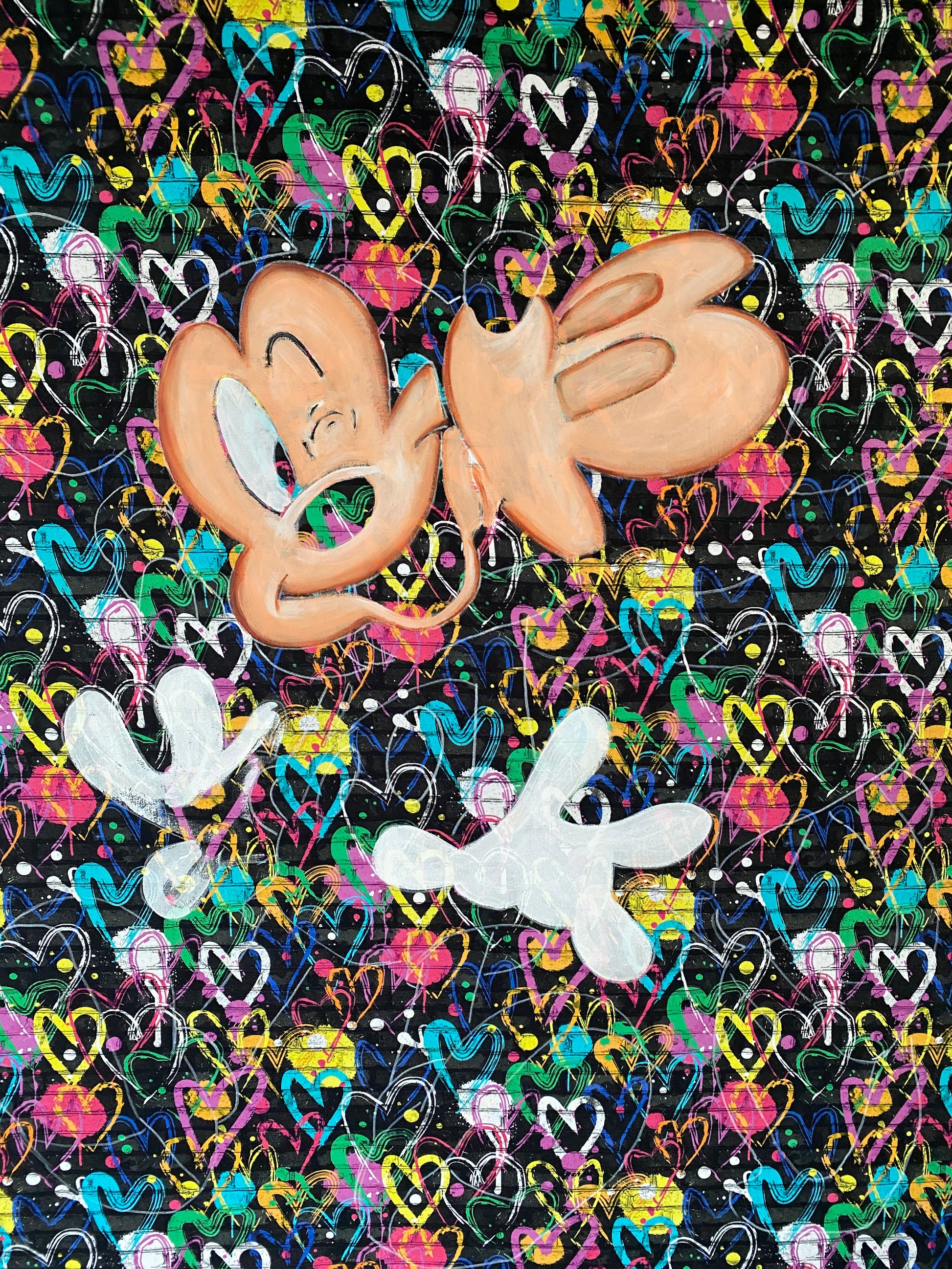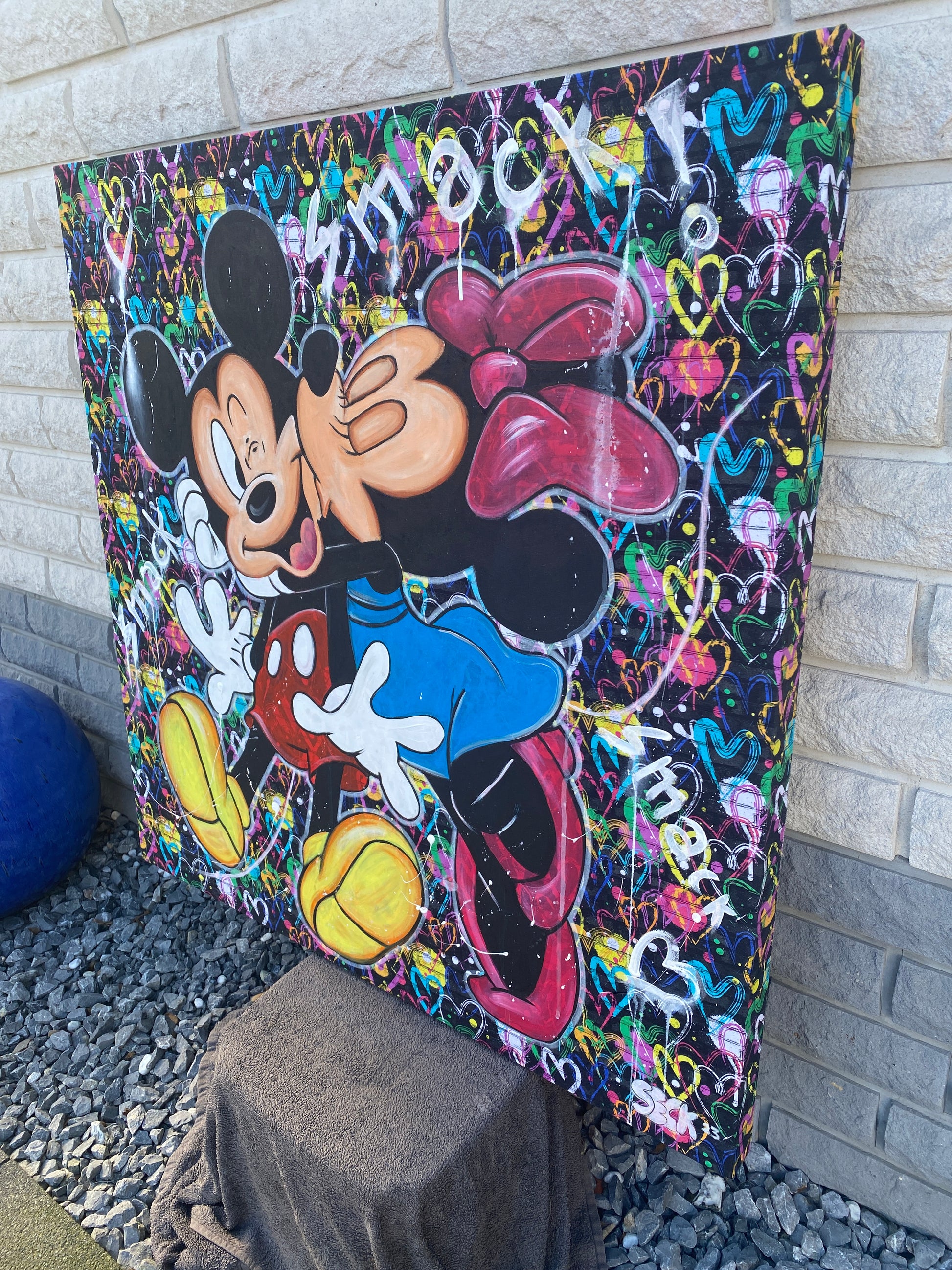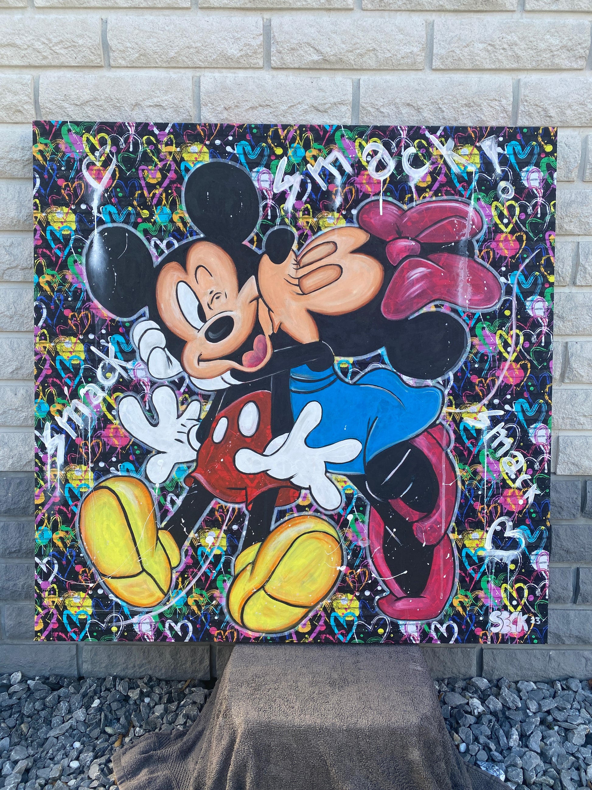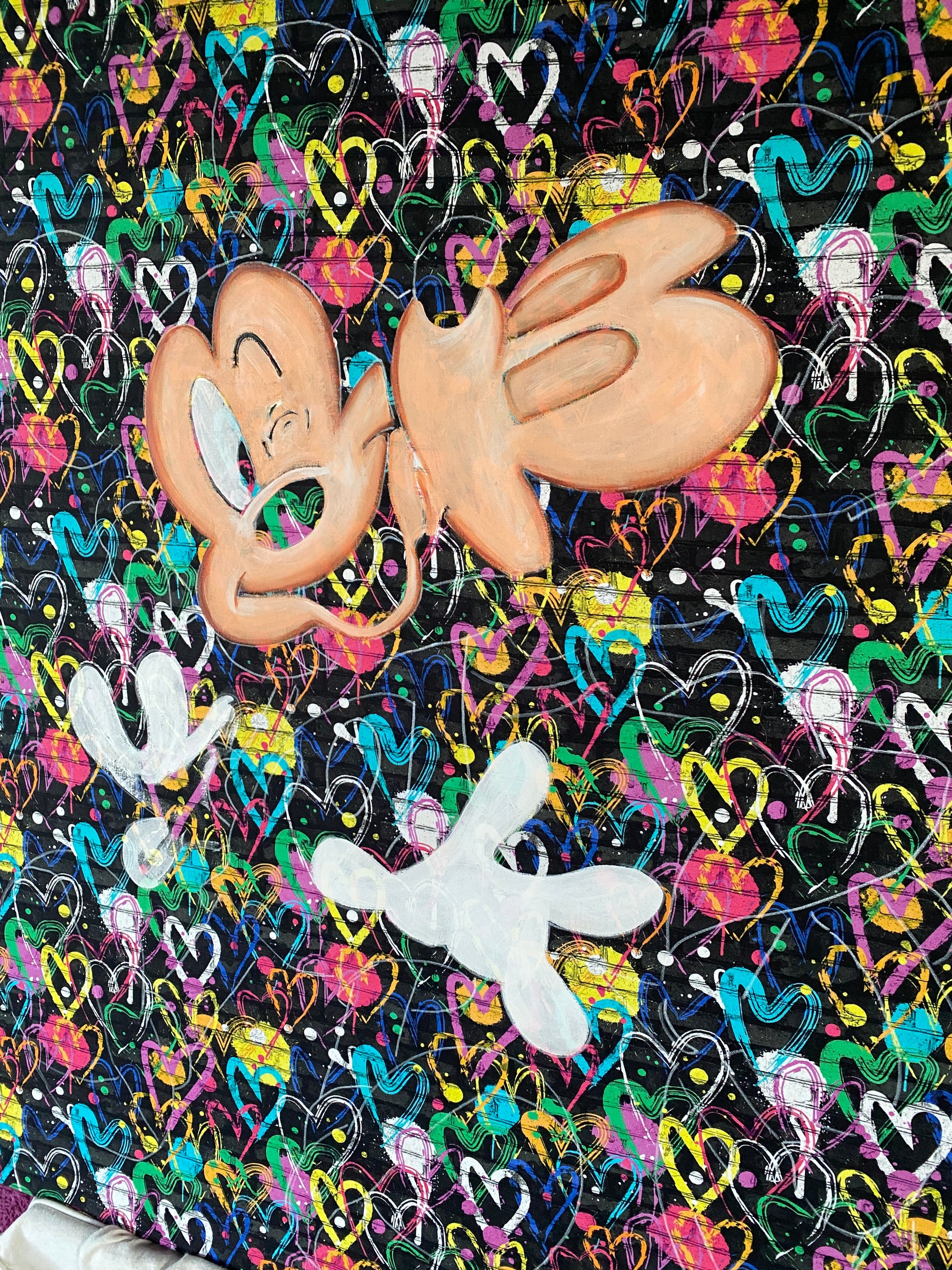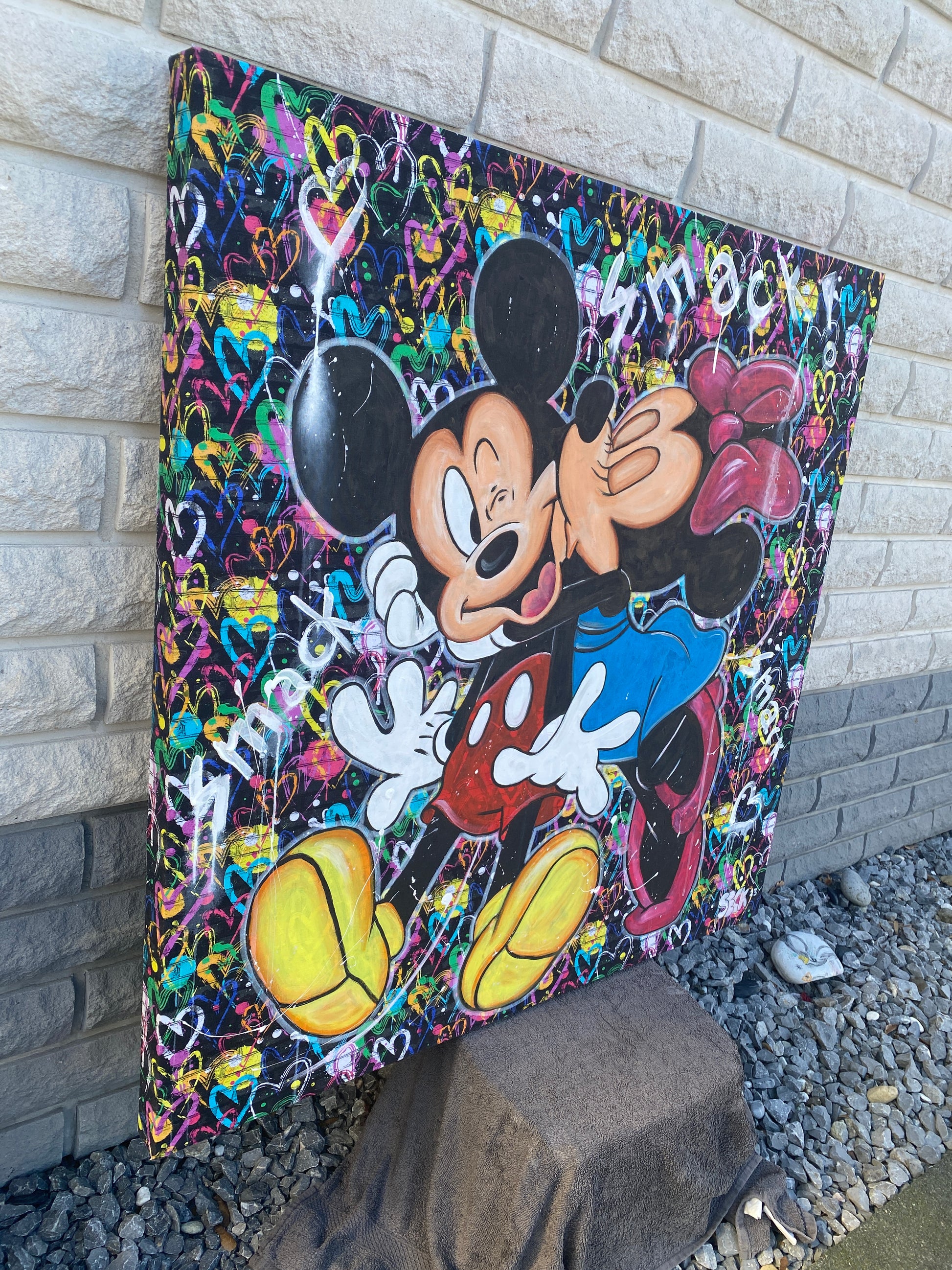 Zuerst wurde ein hochwertiger Stoff auf die Holzleinwand geklebt. Dann wurde mit Acryl auf den Stoff gemalt. So entstand ein toller Hintergrund, der den beiden verliebten Mäusen gerecht wird.