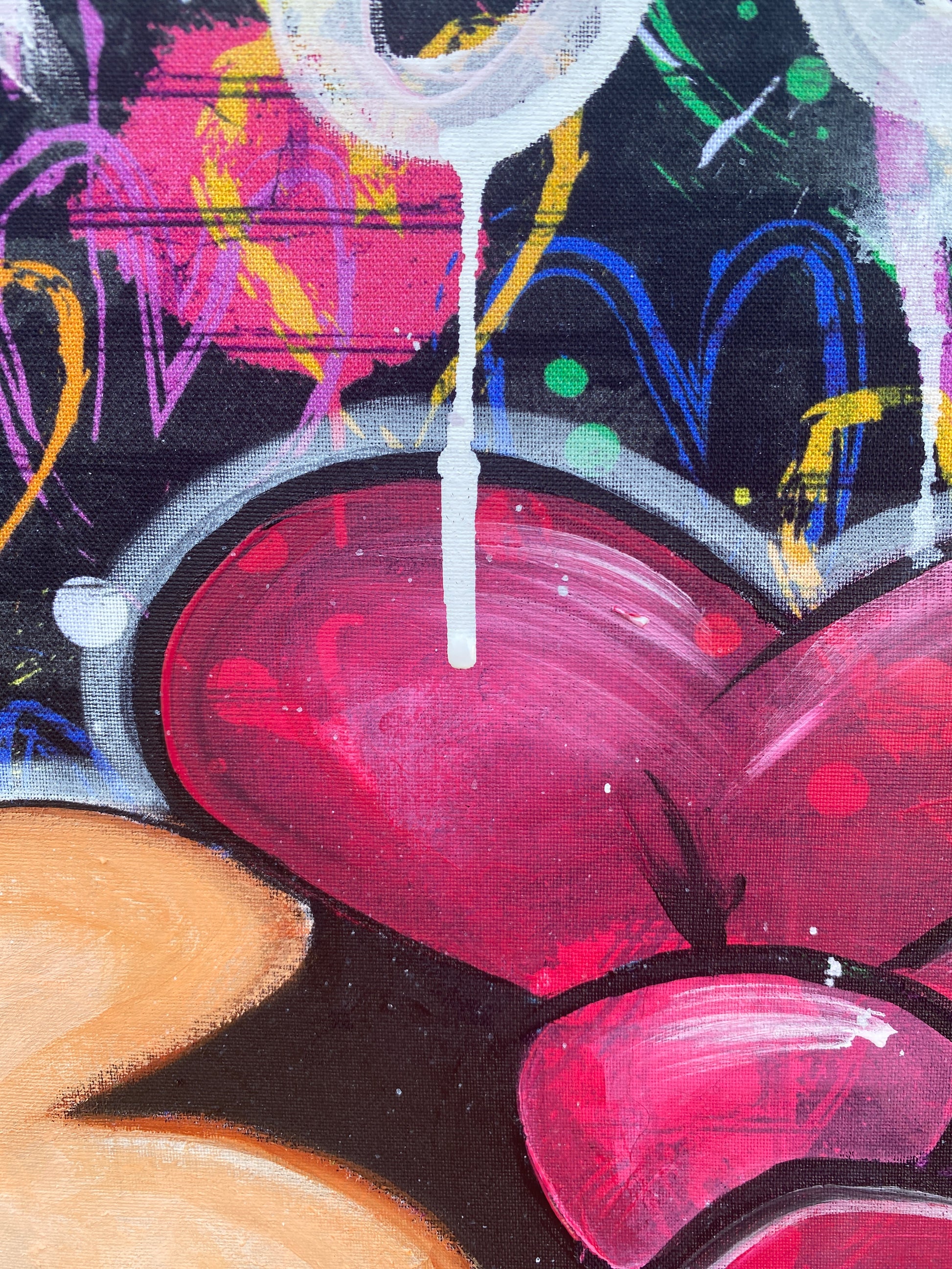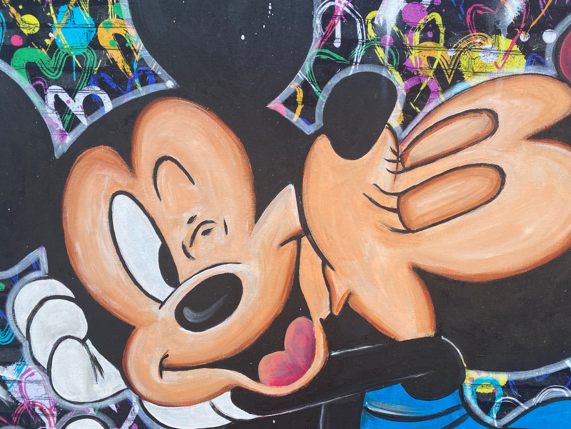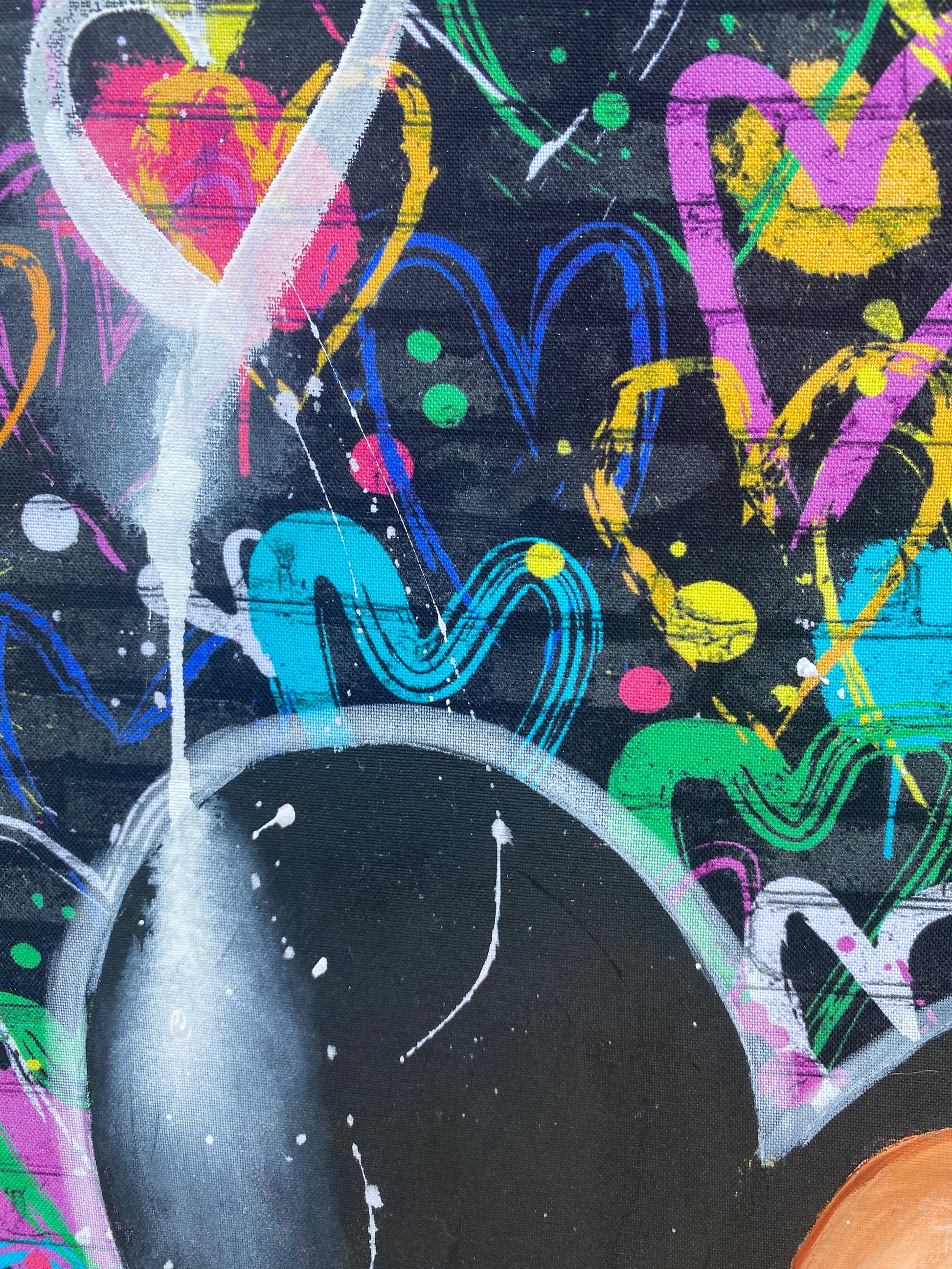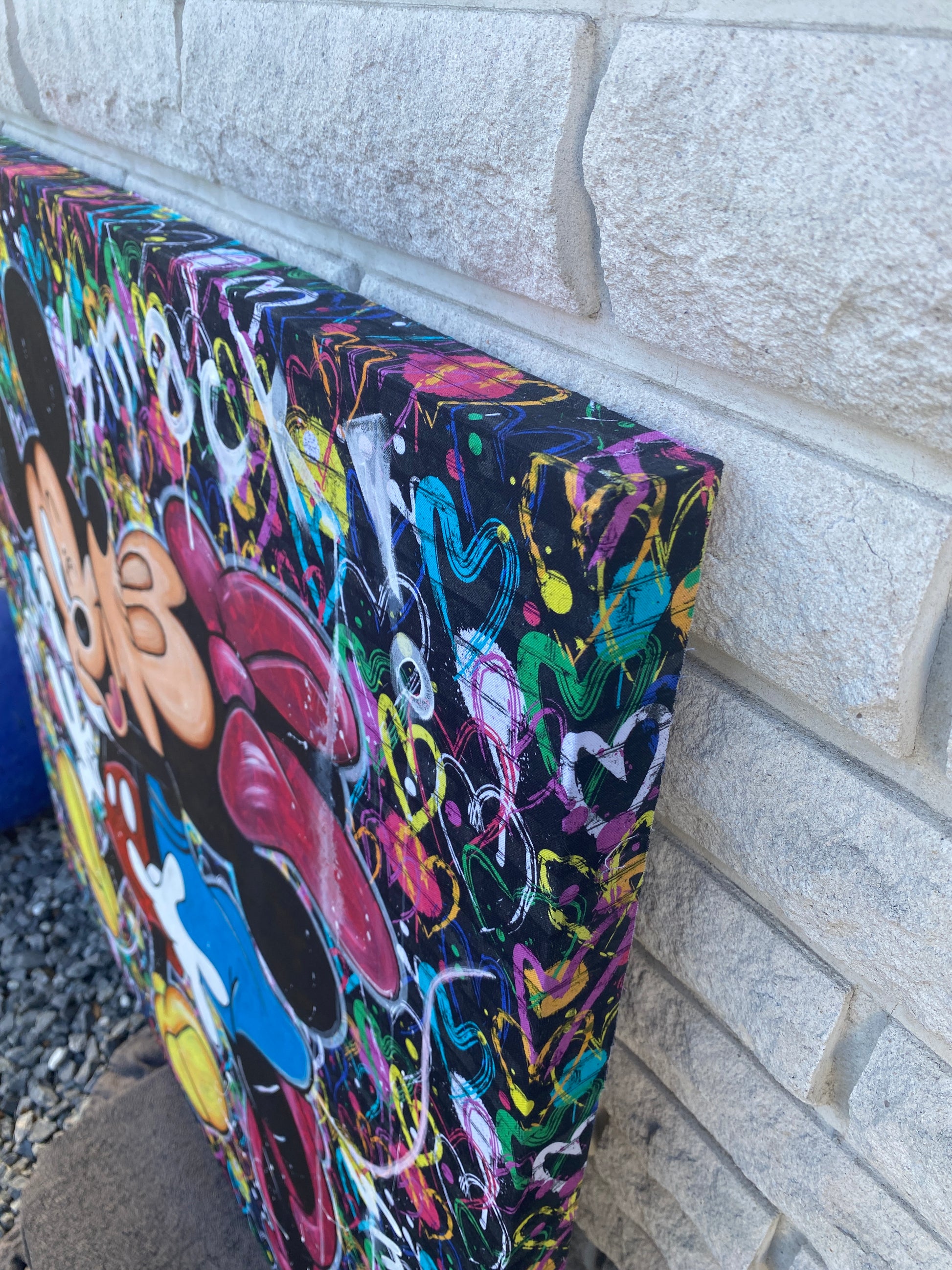 Zuerst wurde ein hochwertiger Stoff auf die Holzleinwand geklebt. Dann wurde mit Acryl auf den Stoff gemalt. So entstand ein toller Hintergrund, der den beiden verliebten Mäusen gerecht wird.