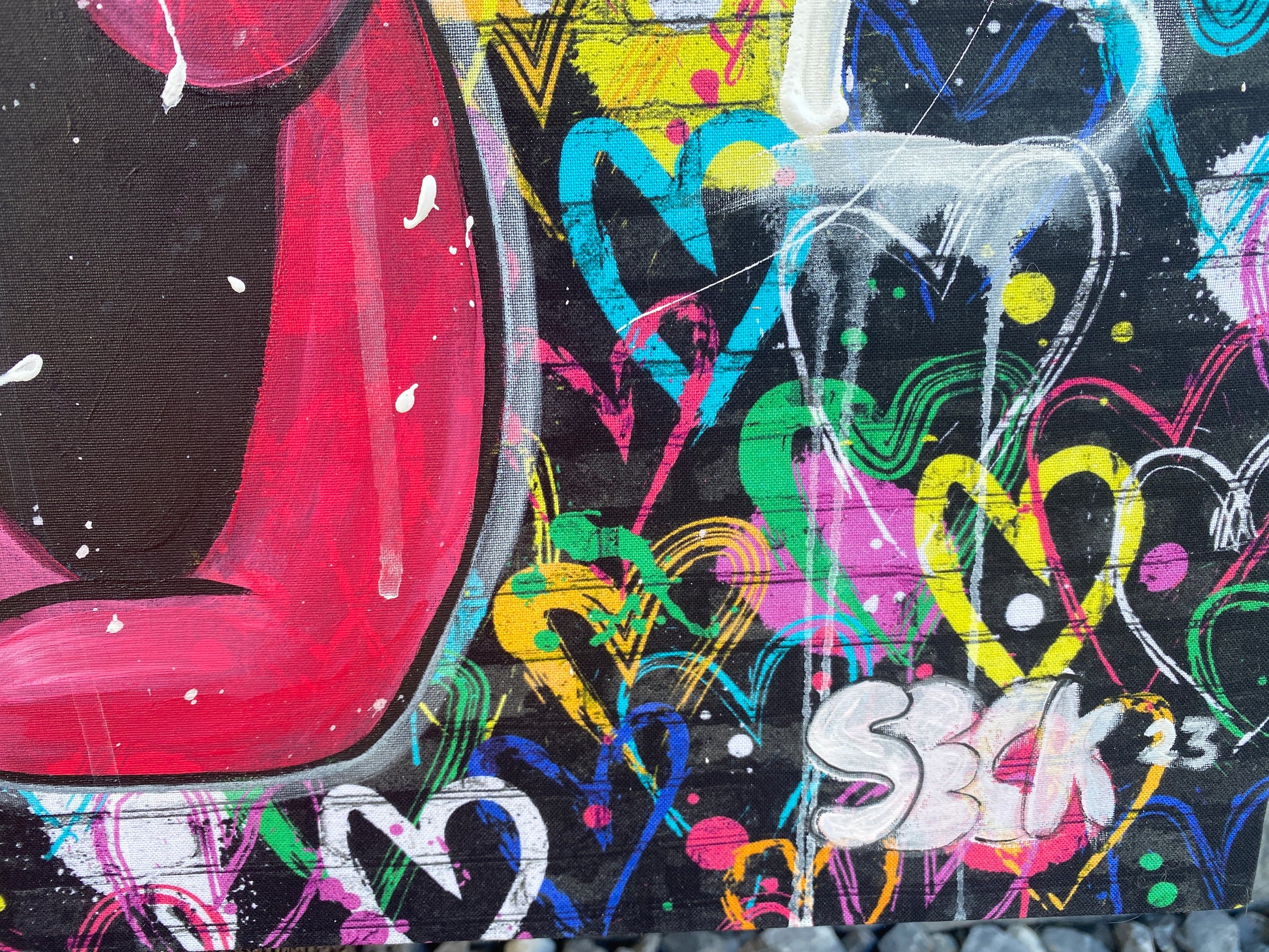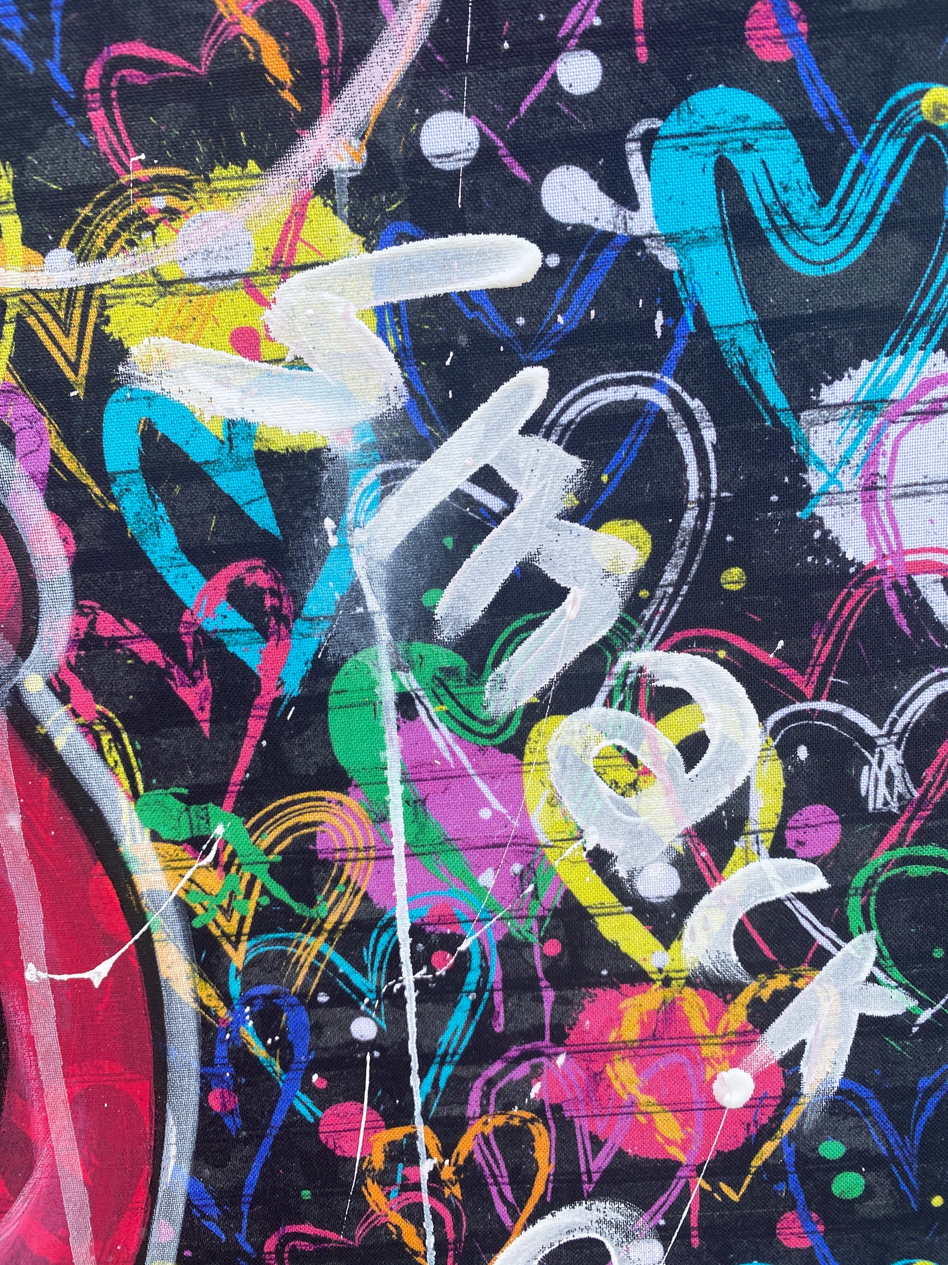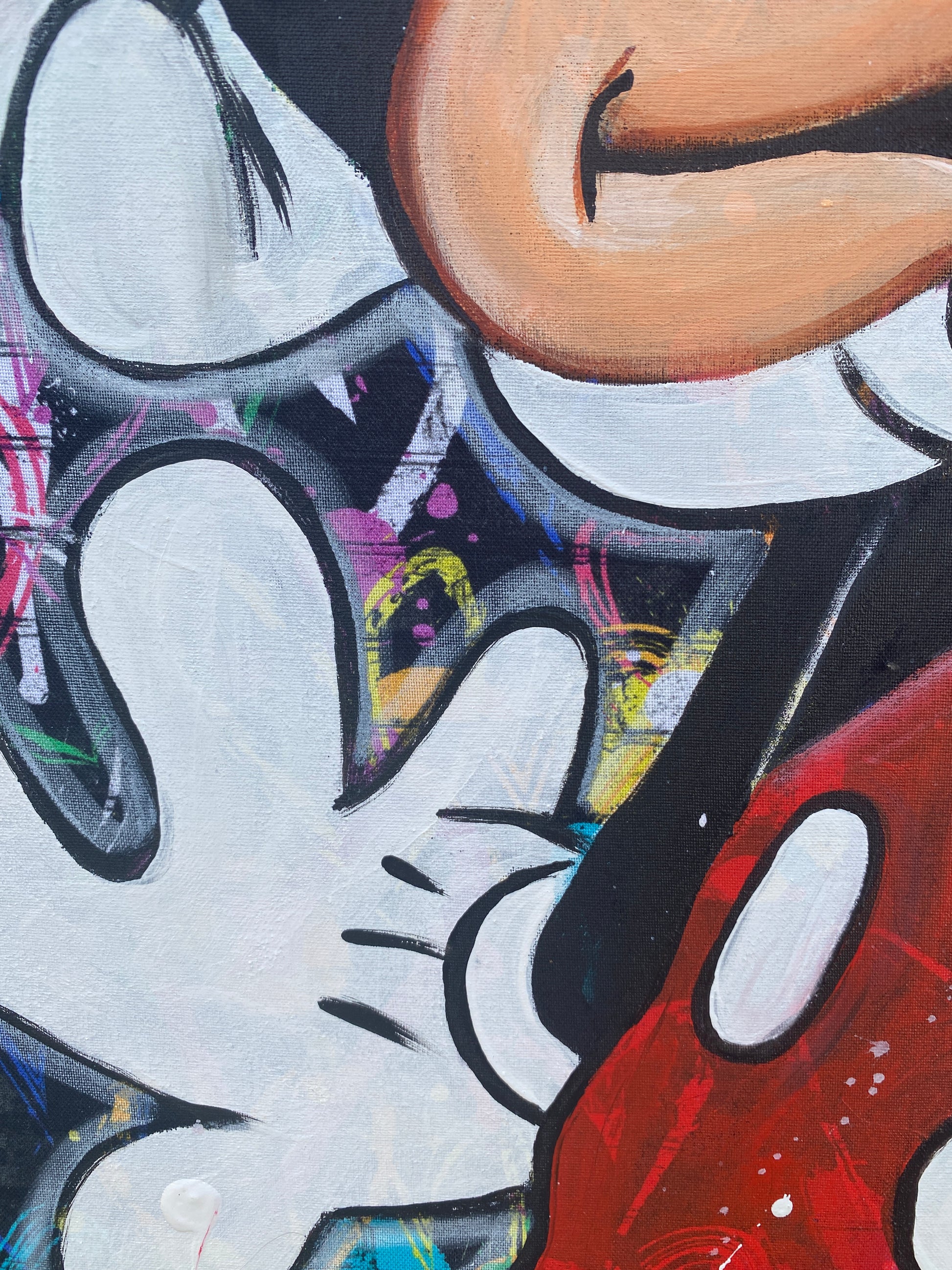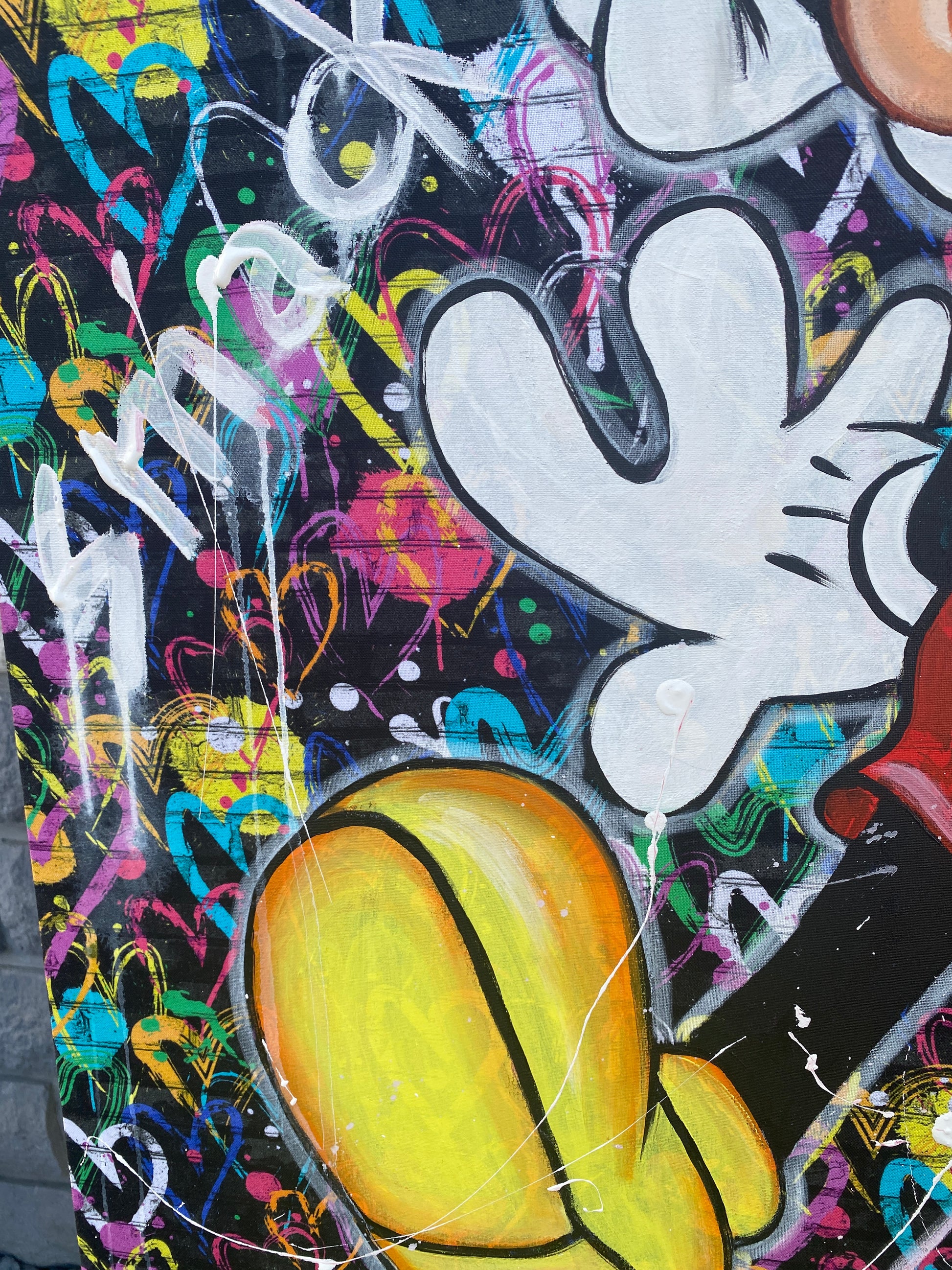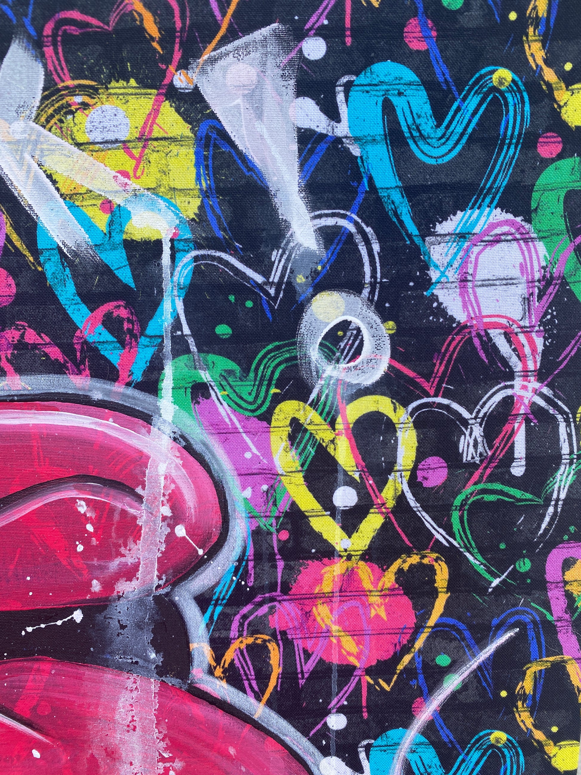 Zuerst wurde ein hochwertiger Stoff auf die Holzleinwand geklebt. Dann wurde mit Acryl auf den Stoff gemalt. So entstand ein toller Hintergrund, der den beiden verliebten Mäusen gerecht wird.