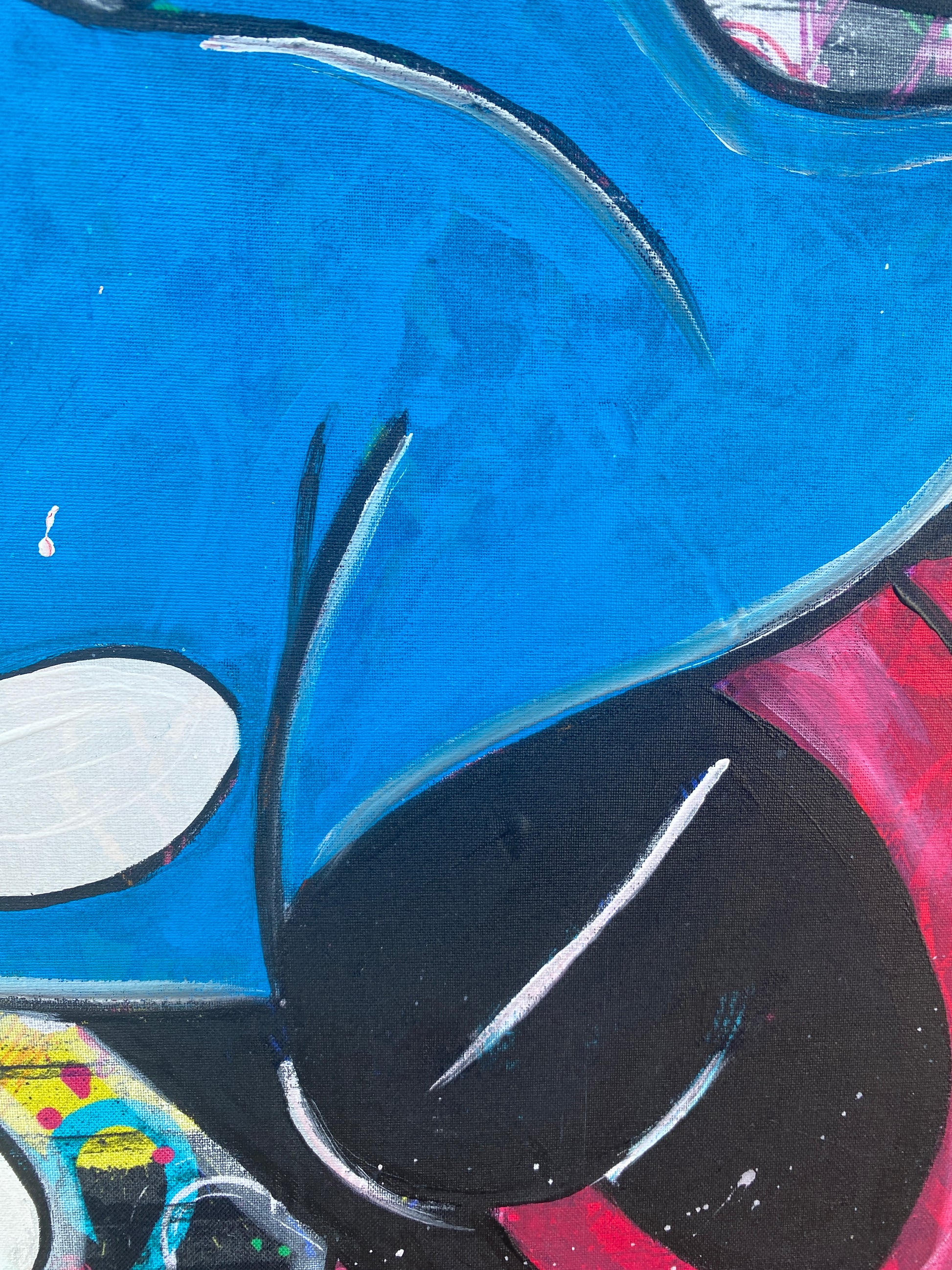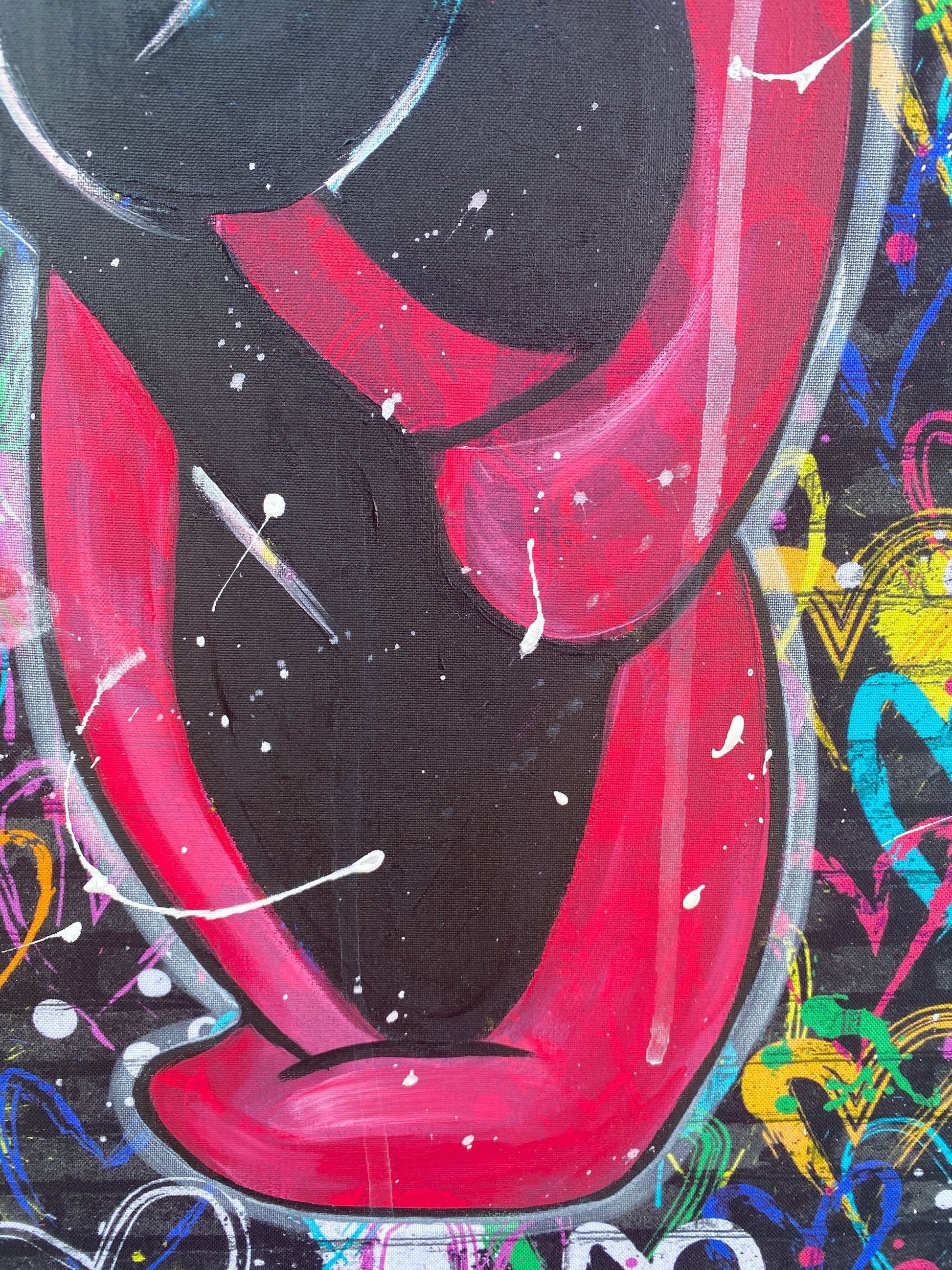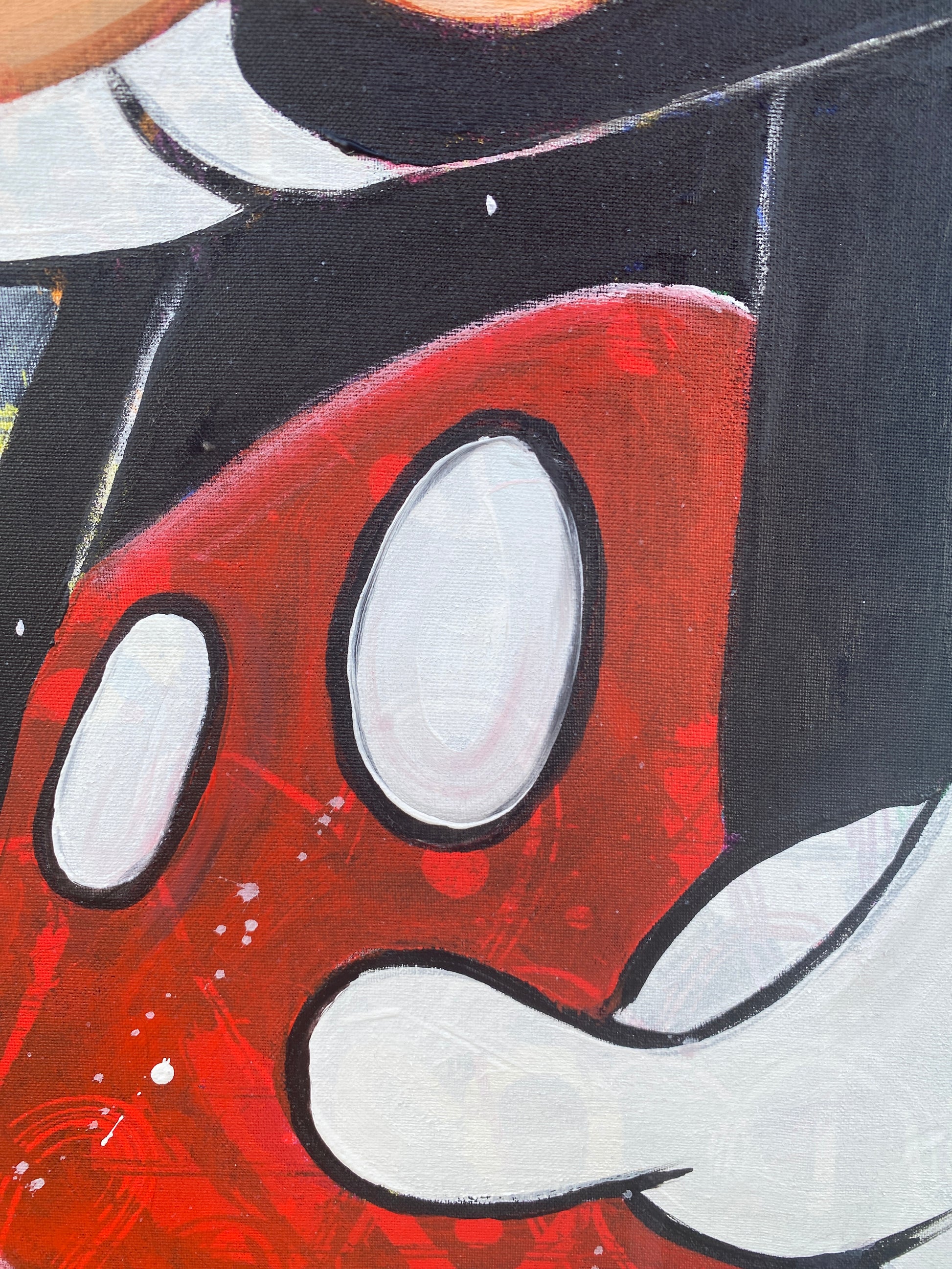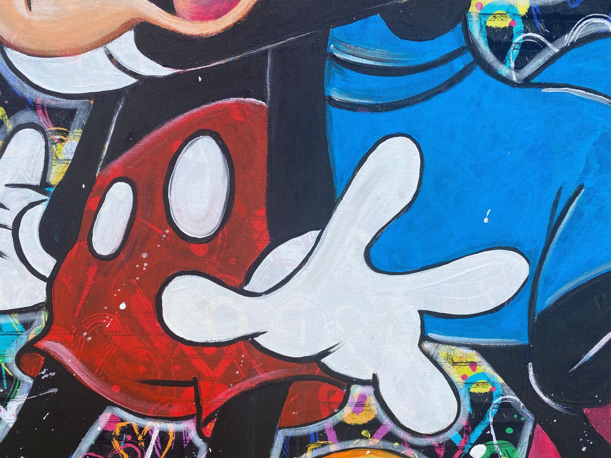 Zuerst wurde ein hochwertiger Stoff auf die Holzleinwand geklebt. Dann wurde mit Acryl auf den Stoff gemalt. So entstand ein toller Hintergrund, der den beiden verliebten Mäusen gerecht wird.