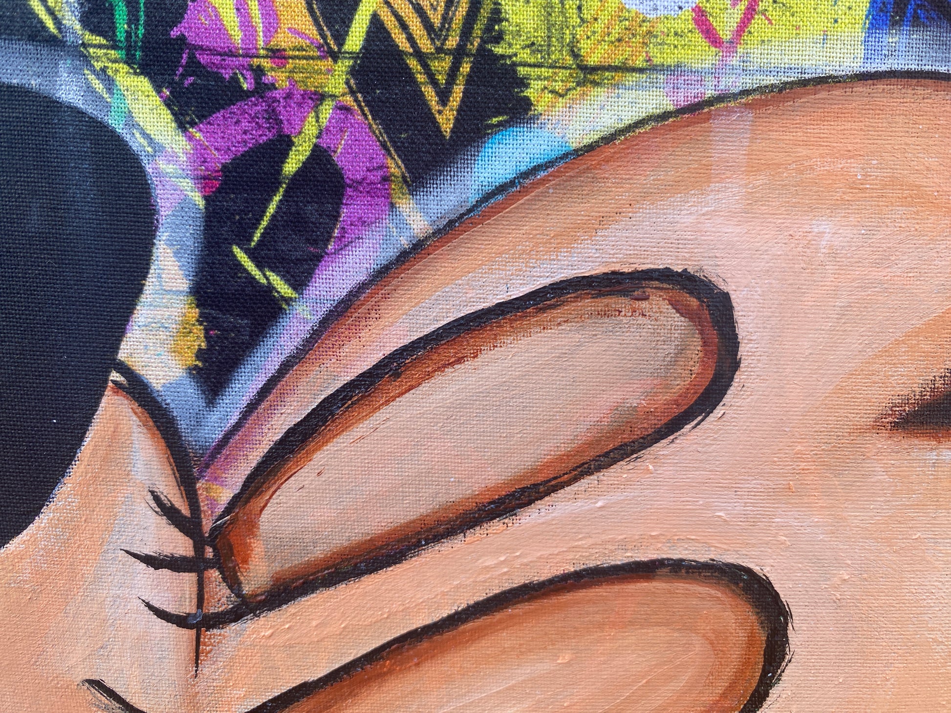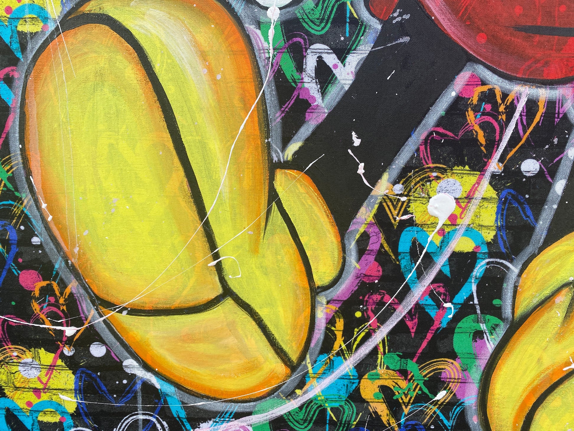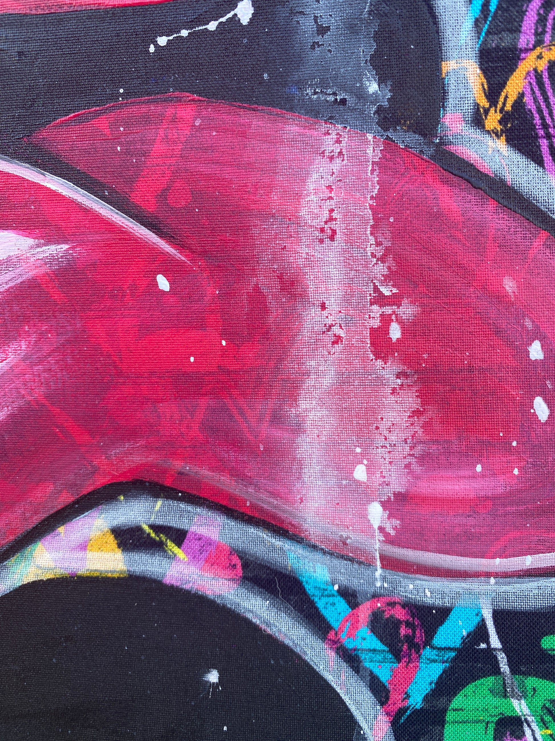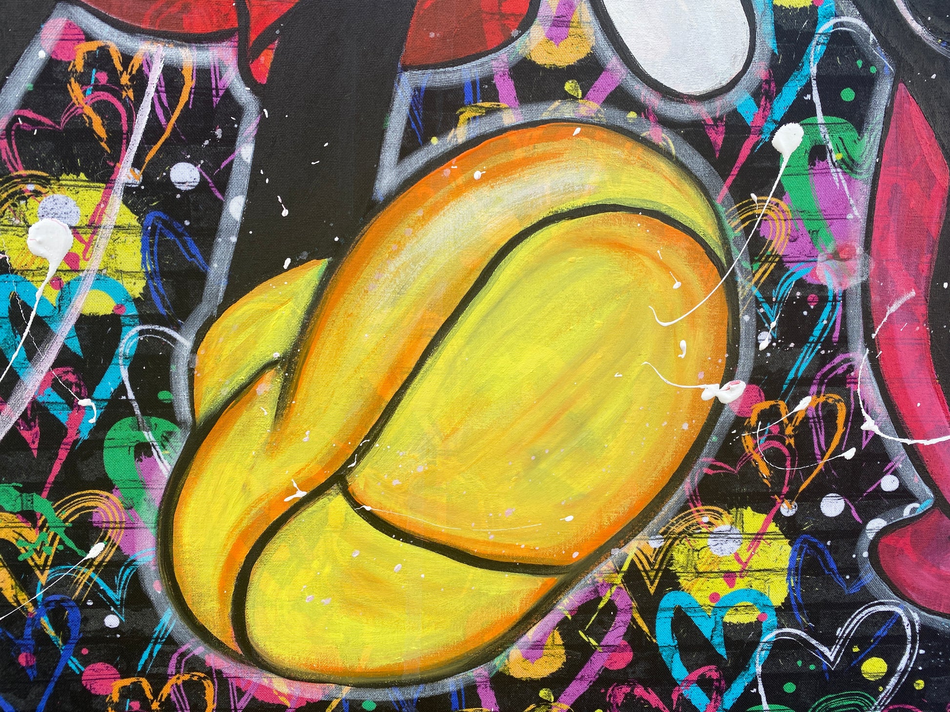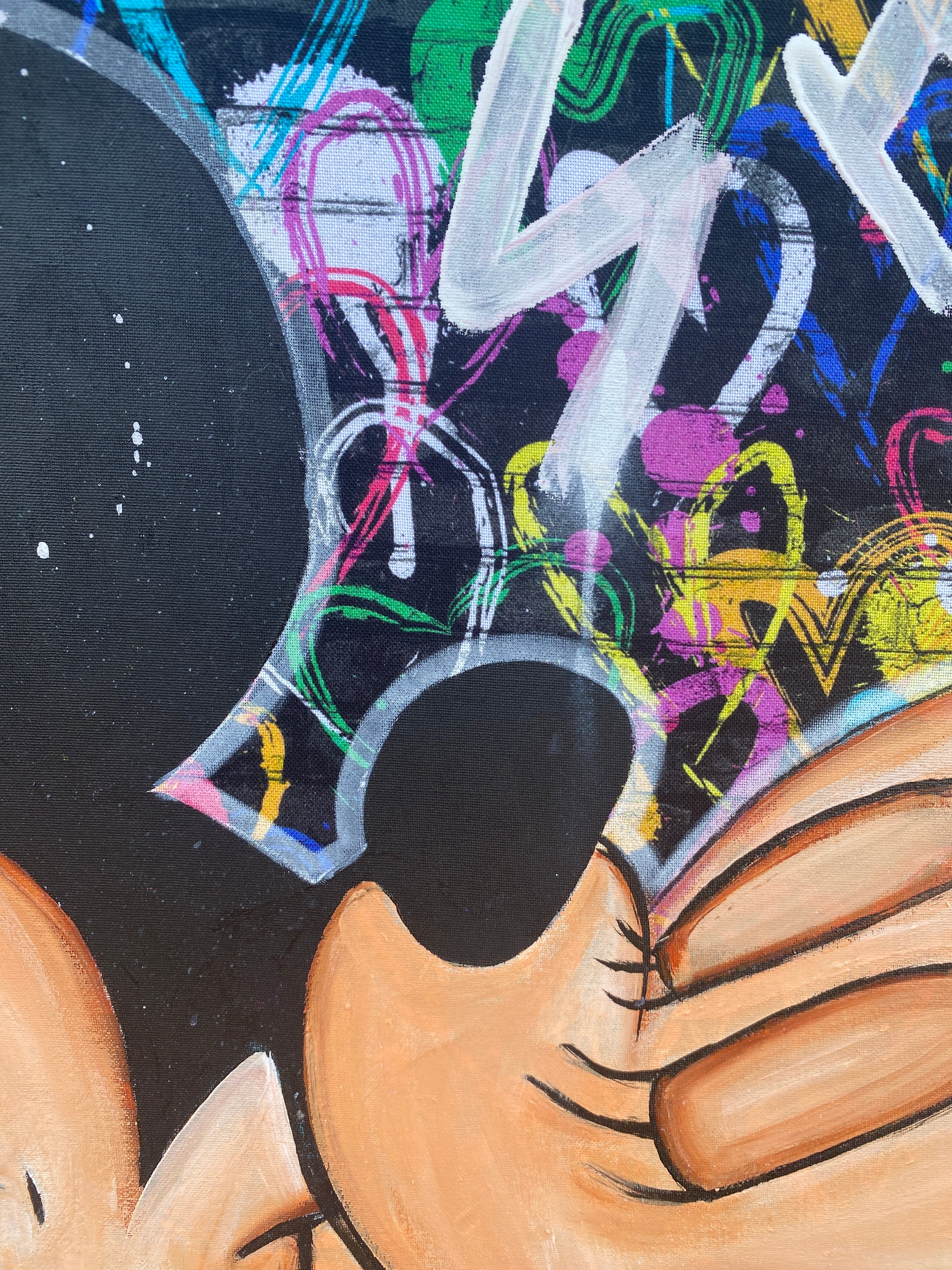 Zuerst wurde ein hochwertiger Stoff auf die Holzleinwand geklebt. Dann wurde mit Acryl auf den Stoff gemalt. So entstand ein toller Hintergrund, der den beiden verliebten Mäusen gerecht wird.