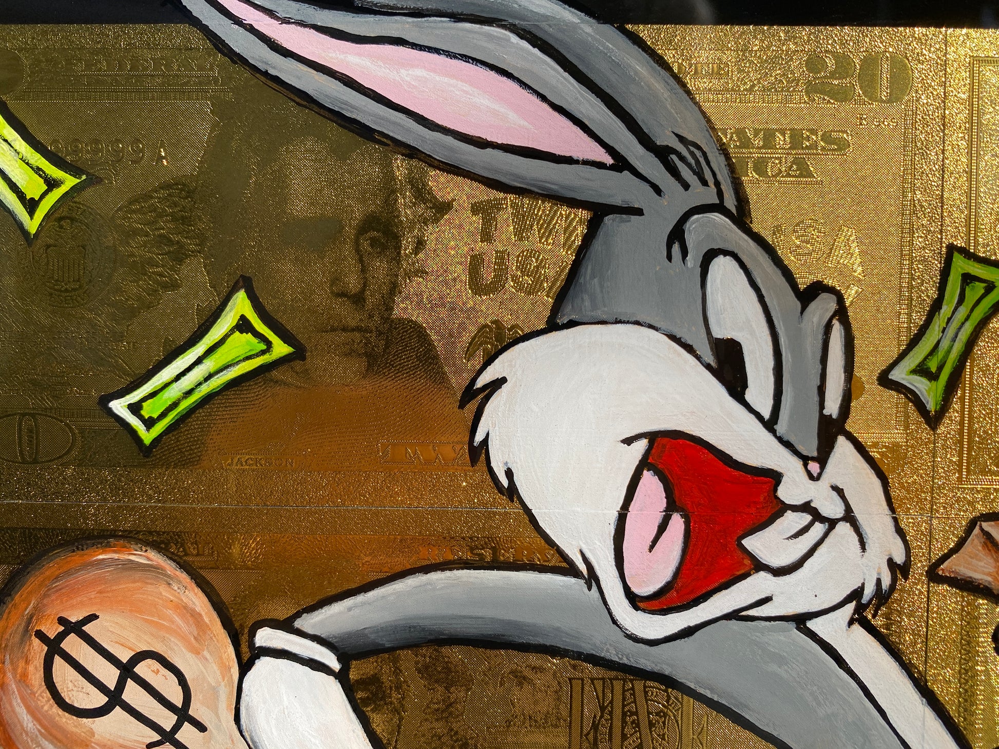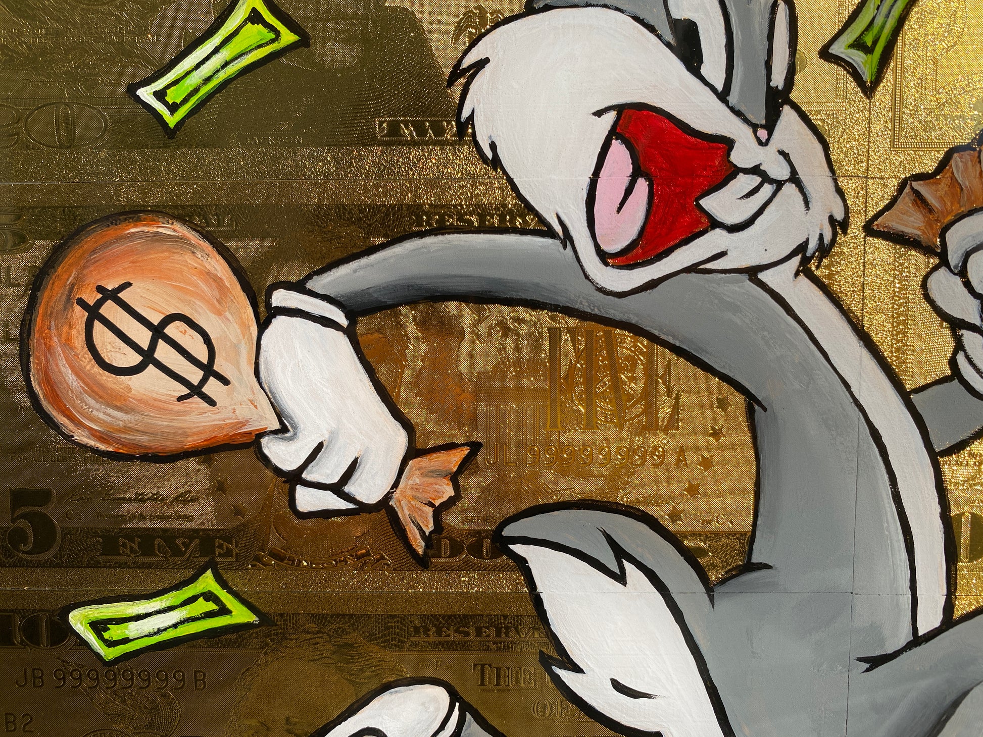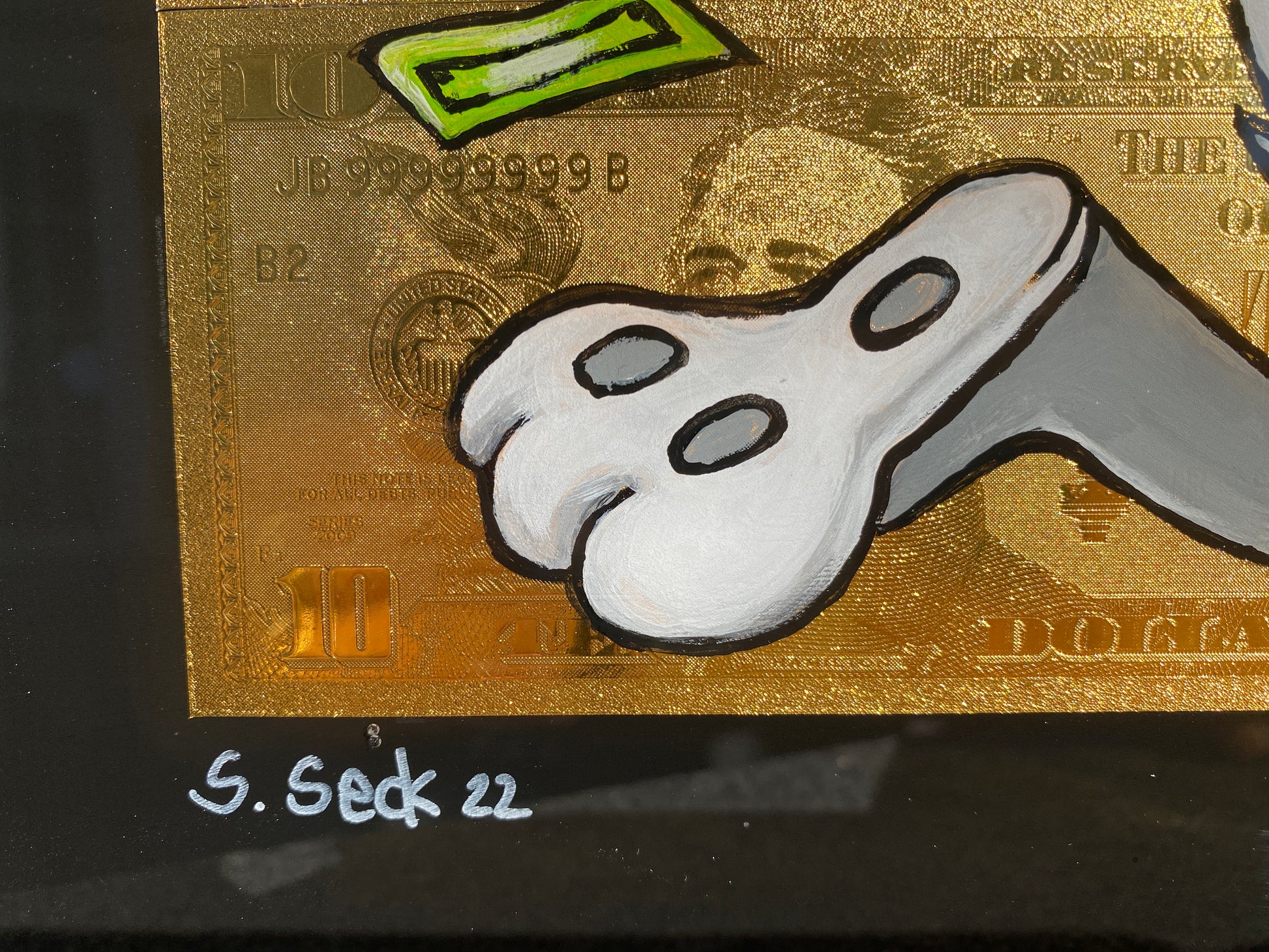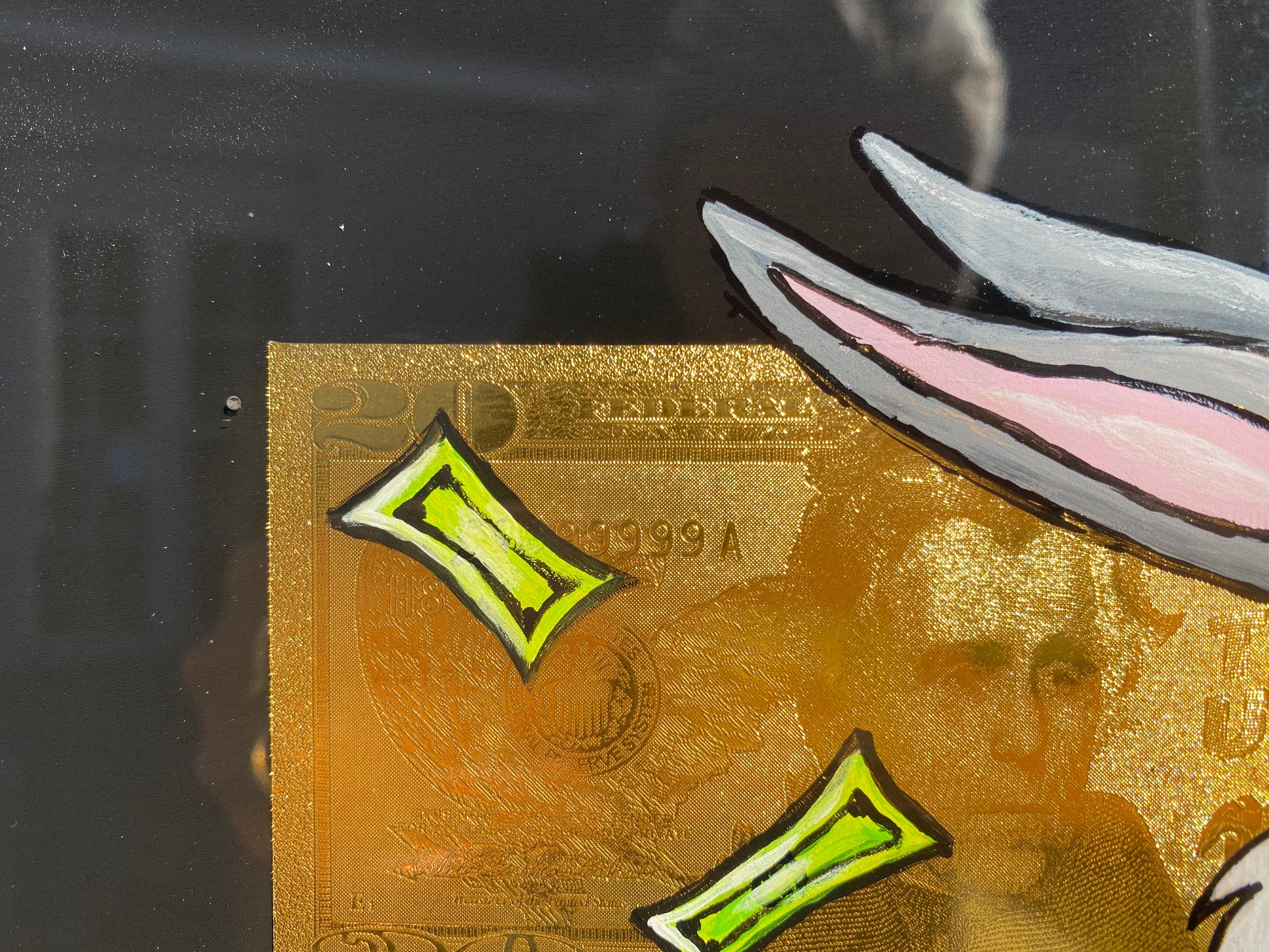 Dieses Werk wurde auf eine Holzleinwand gemalt. Der Hintergrund ist neben dem schwarz mit goldenen Dollarscheinen versehen, die je nach Lichteinfall schimmern. Diese Dollarscheine sind 24 Karat vergoldet. Ein Zertifikat liegt bei.
