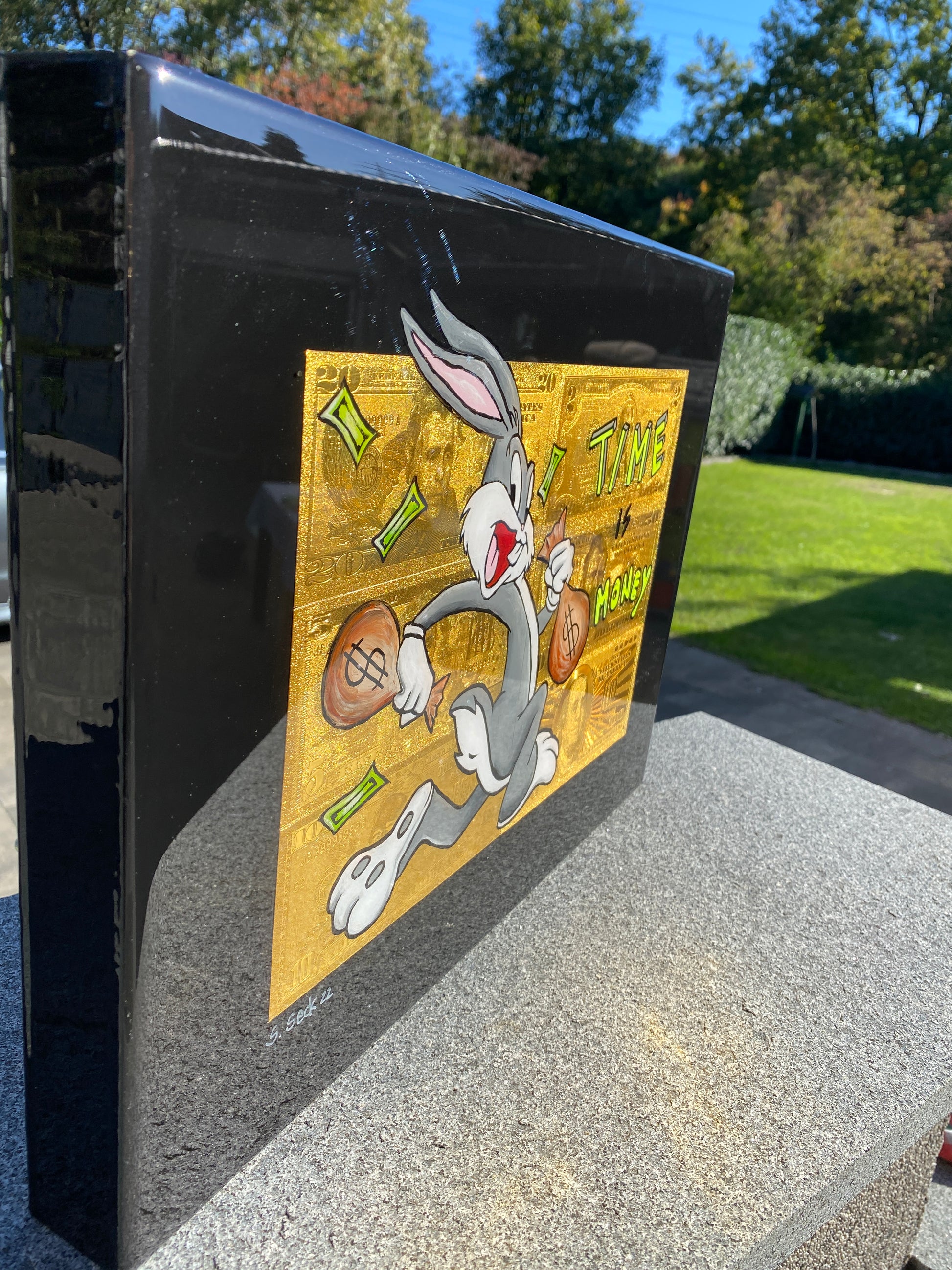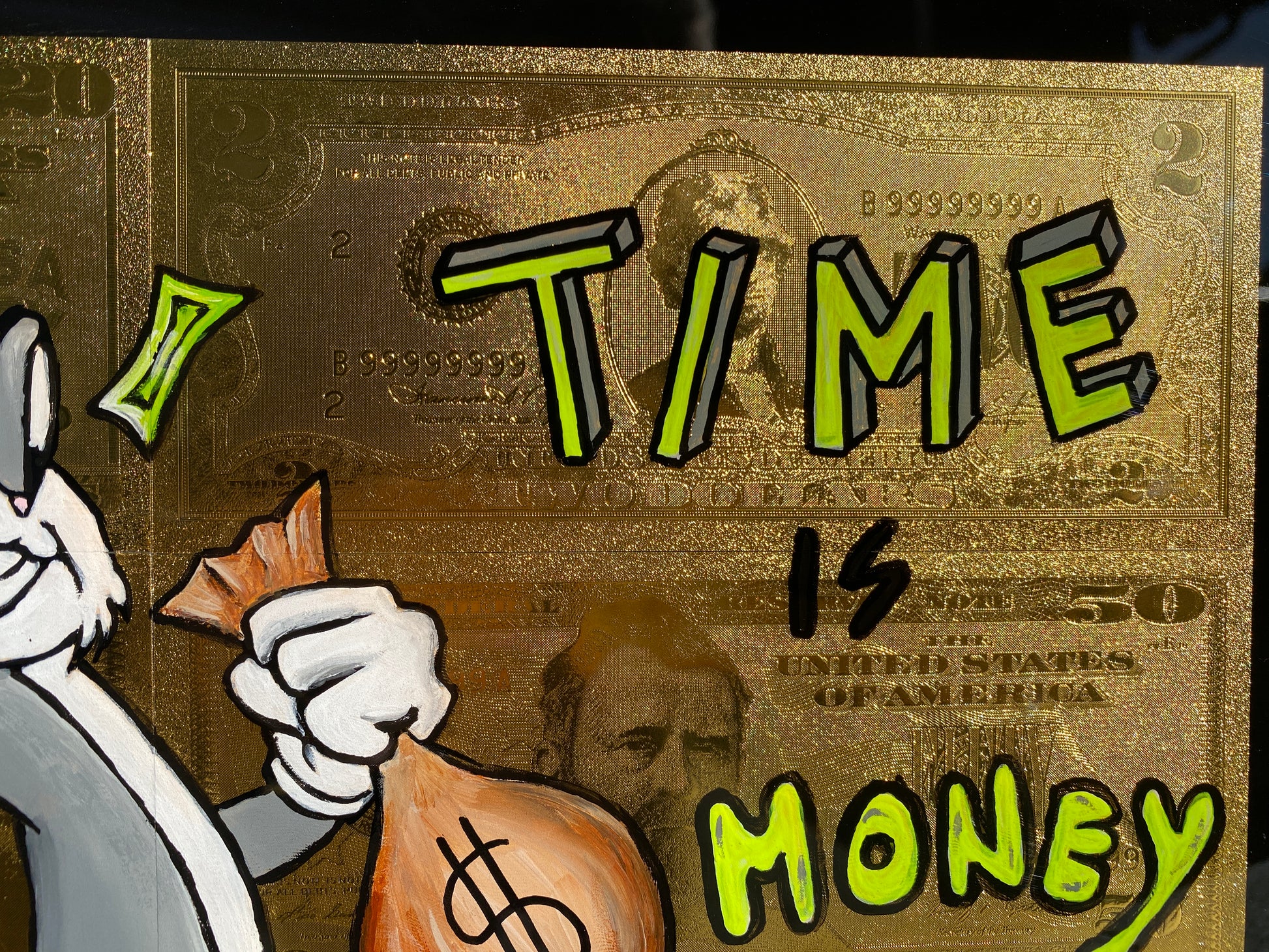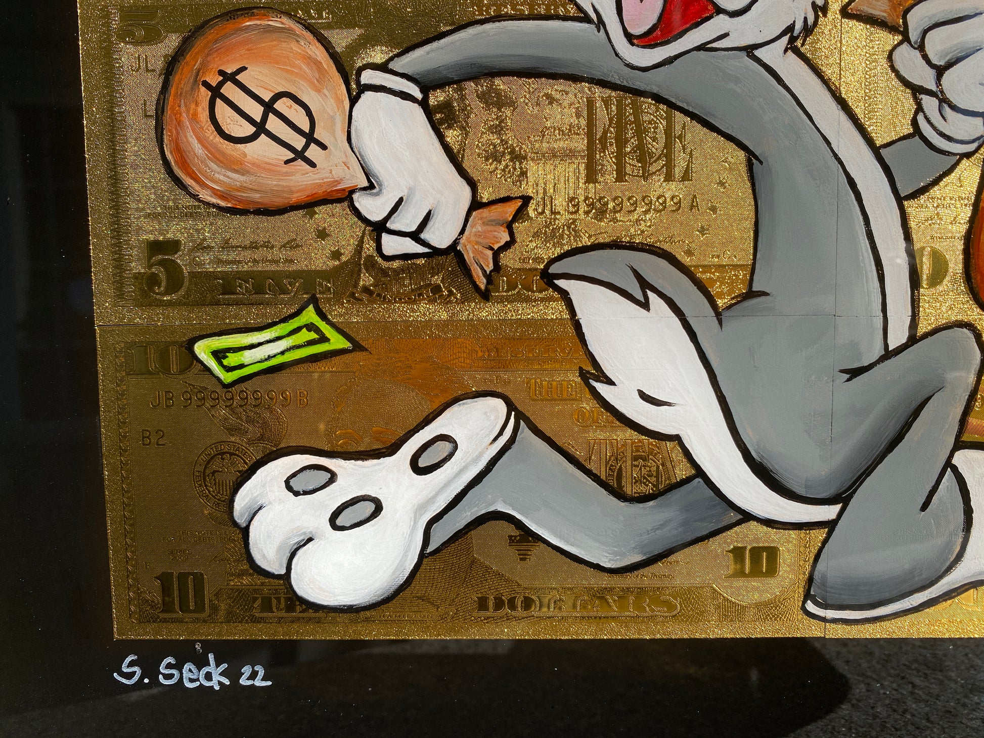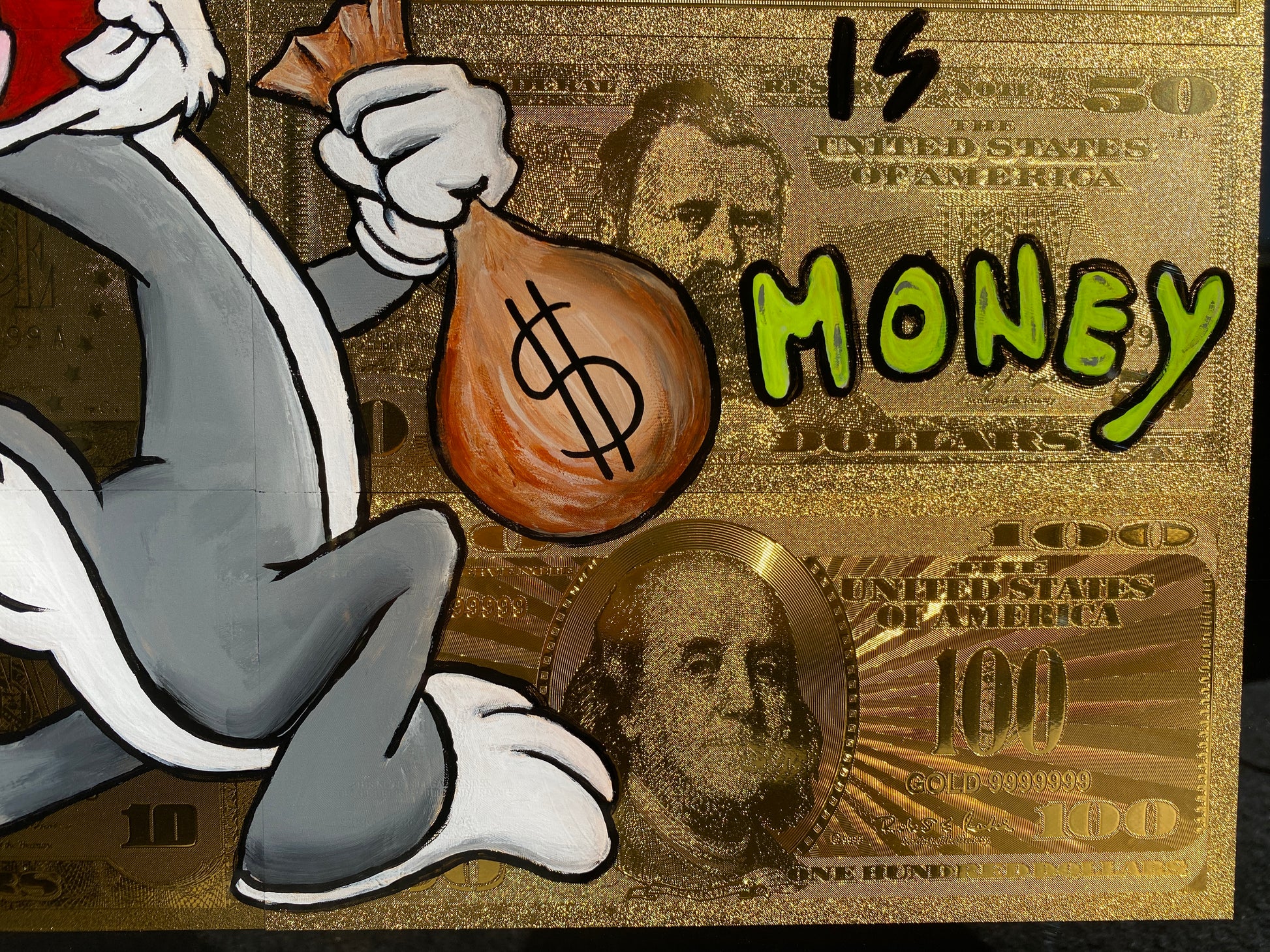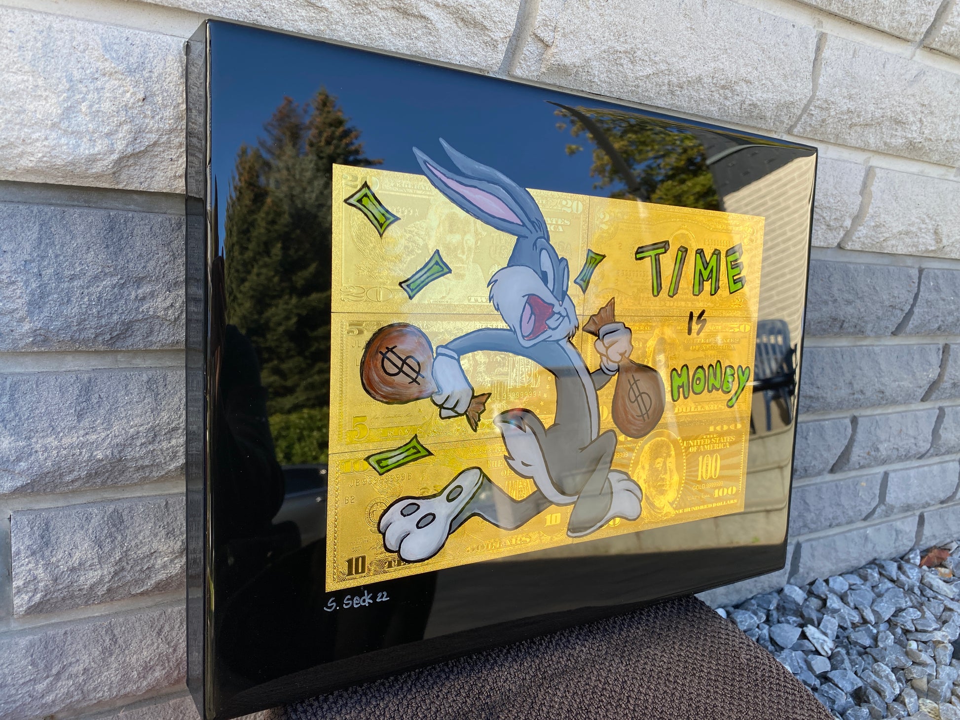 Dieses Werk wurde auf eine Holzleinwand gemalt. Der Hintergrund ist neben dem schwarz mit goldenen Dollarscheinen versehen, die je nach Lichteinfall schimmern. Diese Dollarscheine sind 24 Karat vergoldet. Ein Zertifikat liegt bei.