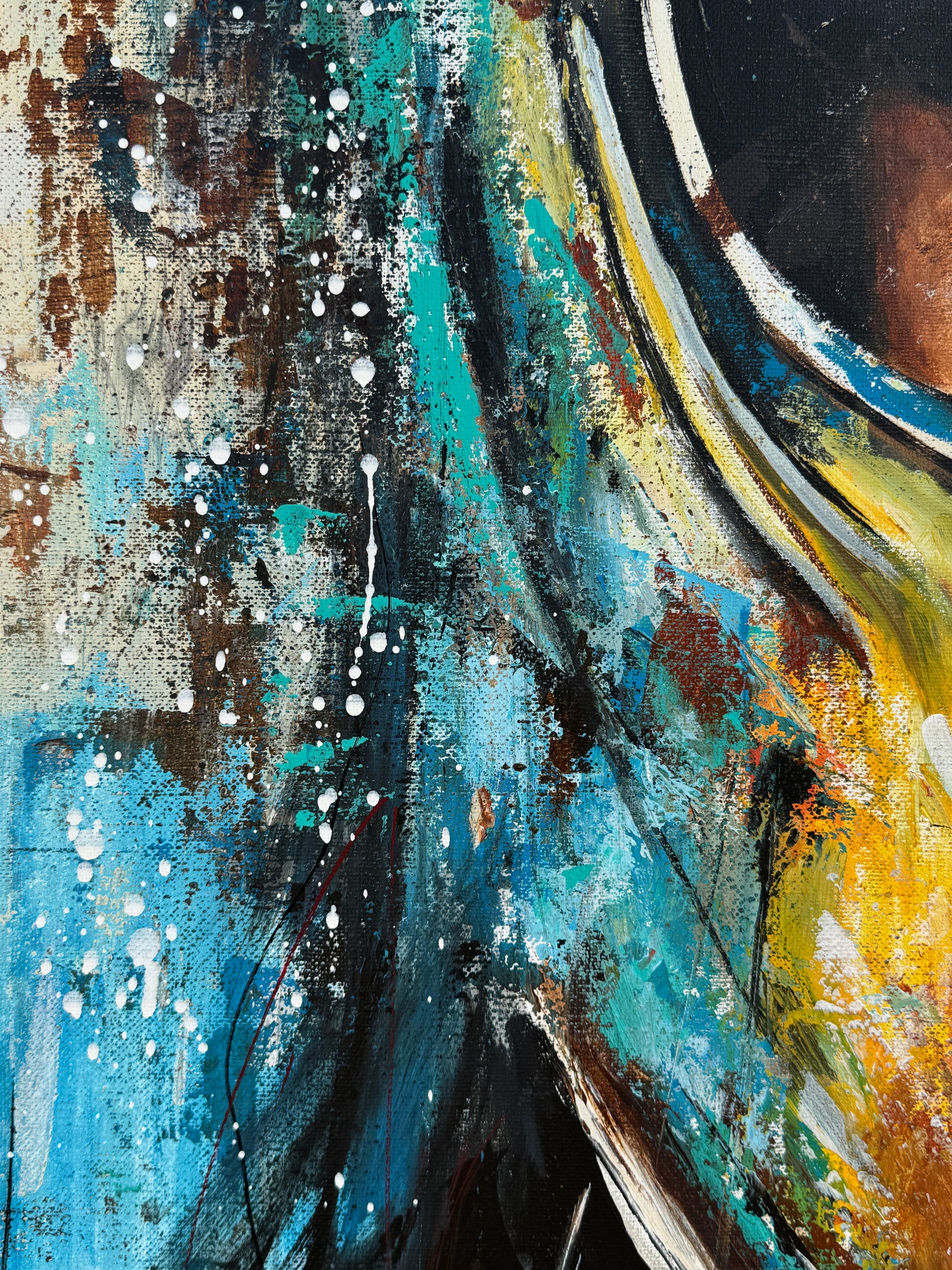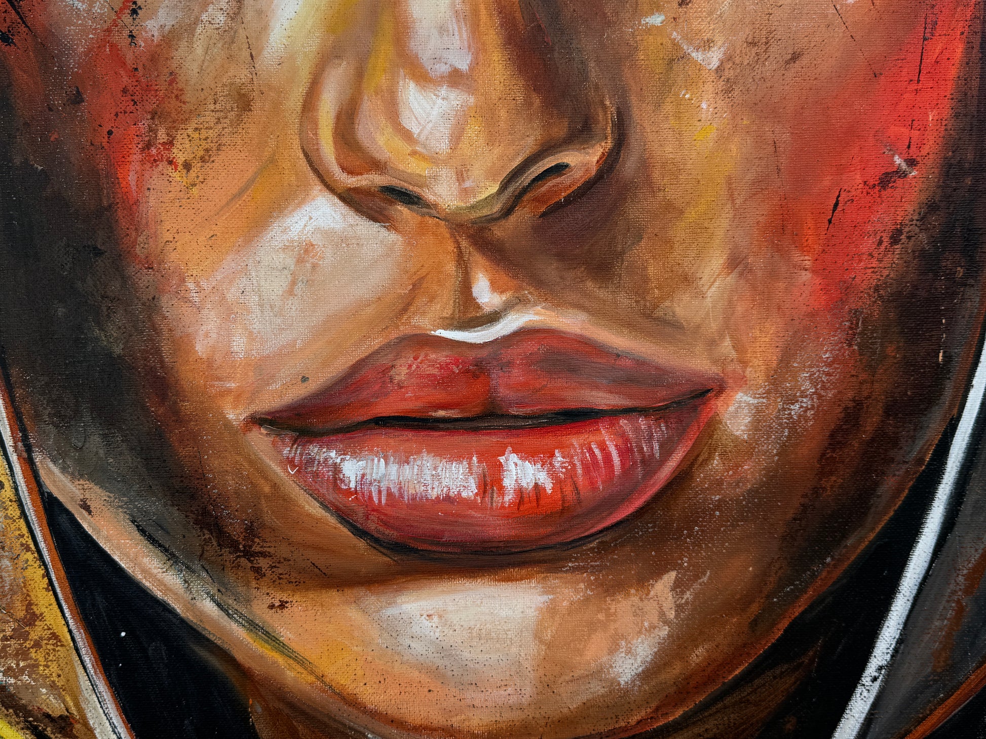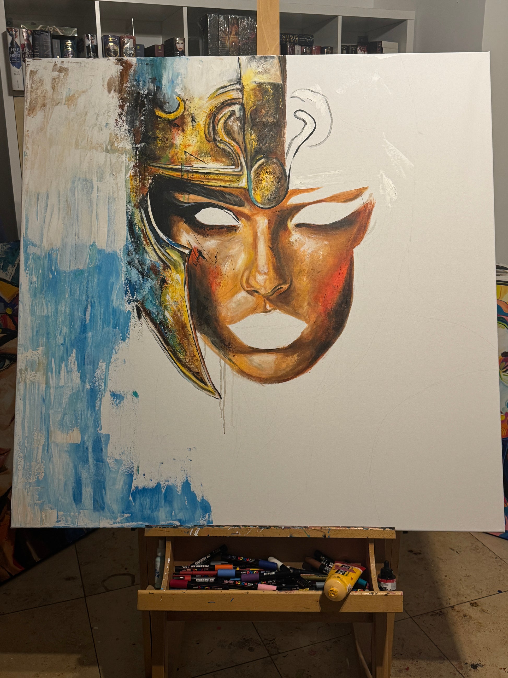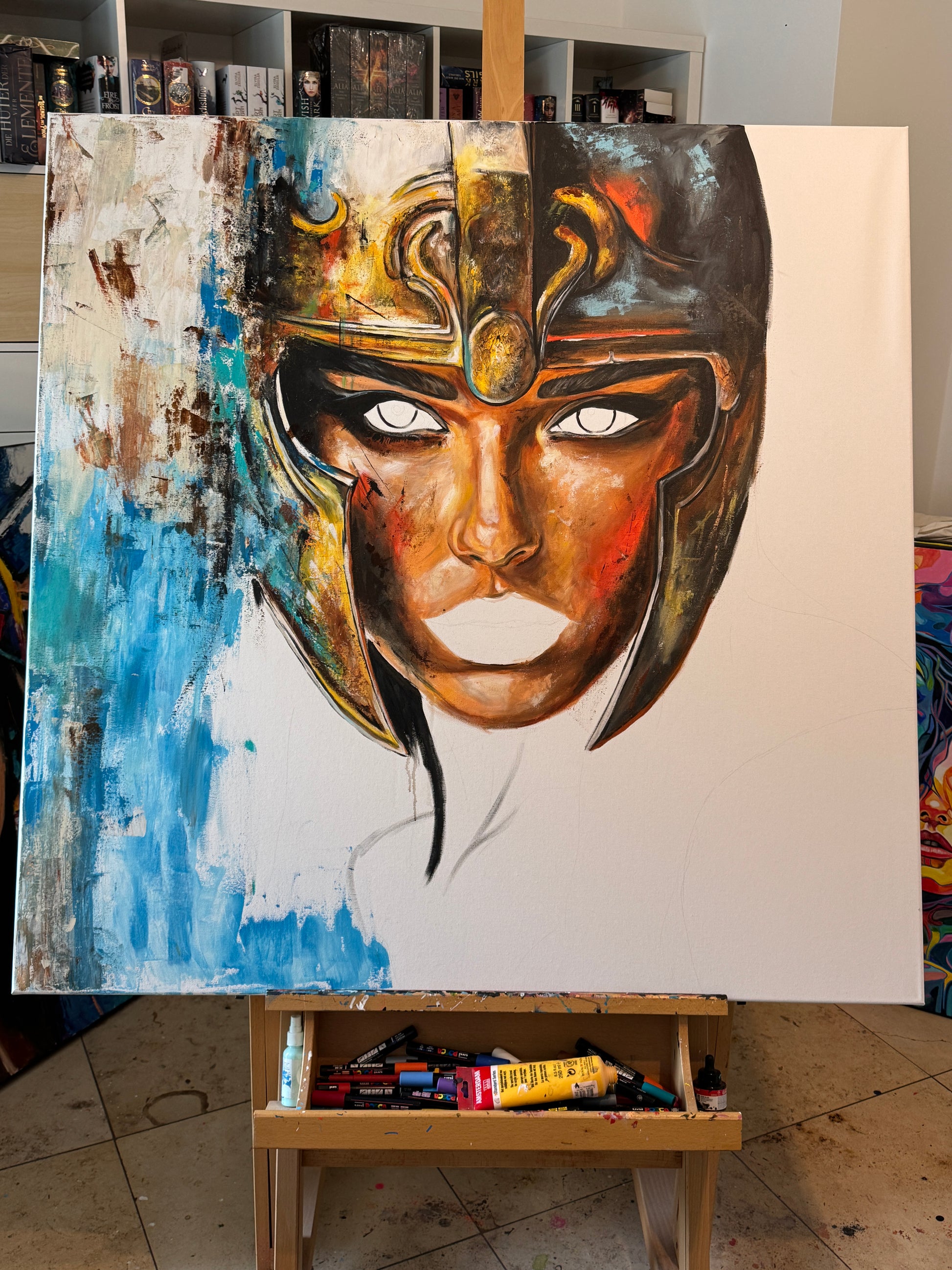 Die beeindruckenden Augen, unerschrocken und fesselnd, sind das Herzstück des Werks und verkörpern Mut und die Fähigkeit, Herausforderungen direkt zu begegnen. Denn jeder Mensch hat seine eigenen Kämpfe zu führen. Sei es mit sich selbst oder mit anderen. Die Meisten sind bereit für die, die sie lieben, alles zu tun. Dabei riskieren sie nicht immer wenig. Doch auch für sich selbst lohnt es sich zu kämpfen. Für seine Träume, für seinen Weg, seine Ziele. Um so zu sein, wie man ist. Um so zu bleiben, wie man ist. Um so zu werden, wie man es möchte. Um das Leben lebenswert zu machen. Doch egal für wen oder was wir bereit sind zu kämpfen, wofür wir stark sein wollen, in dem Moment sind wird Krieger.