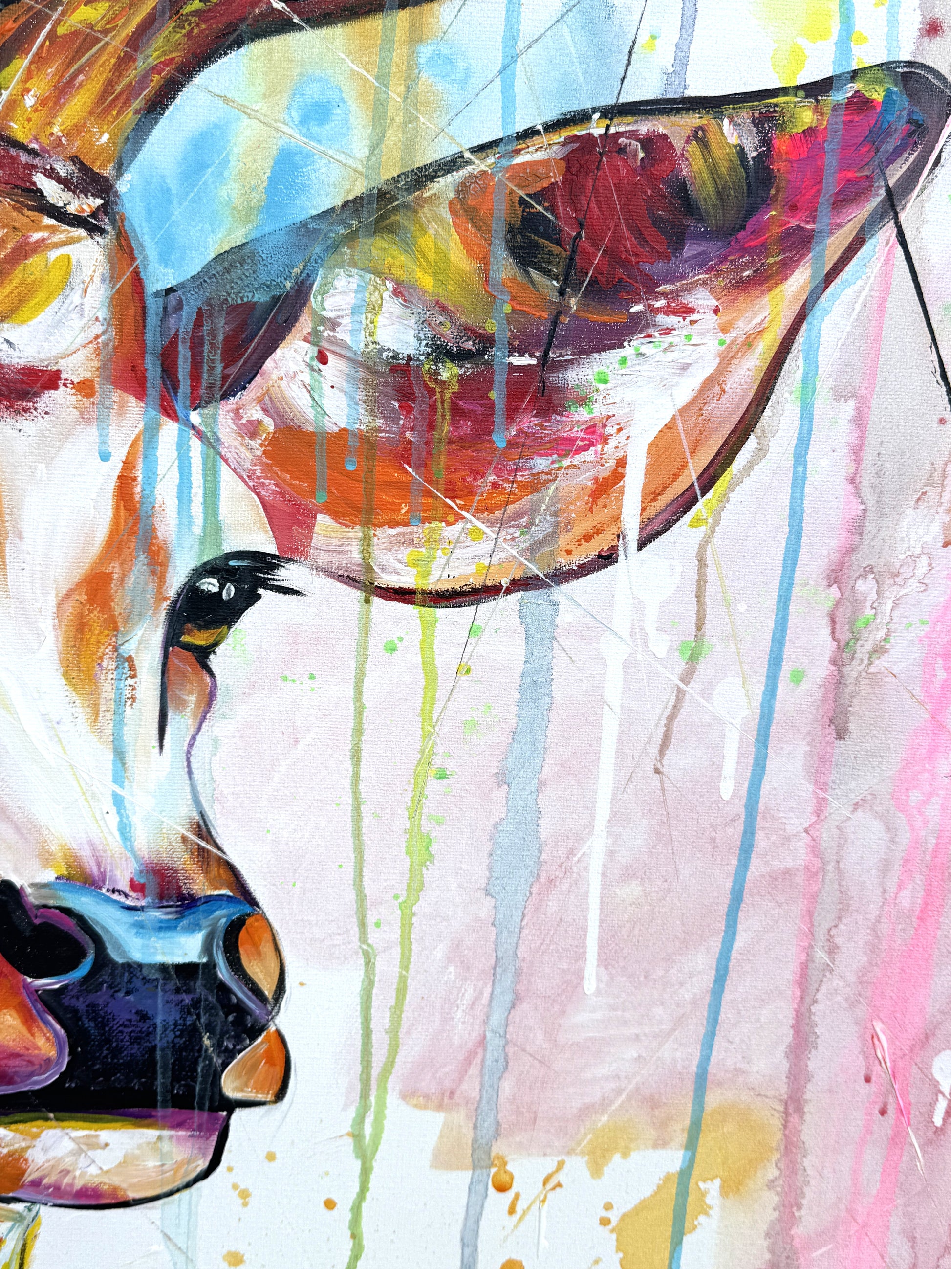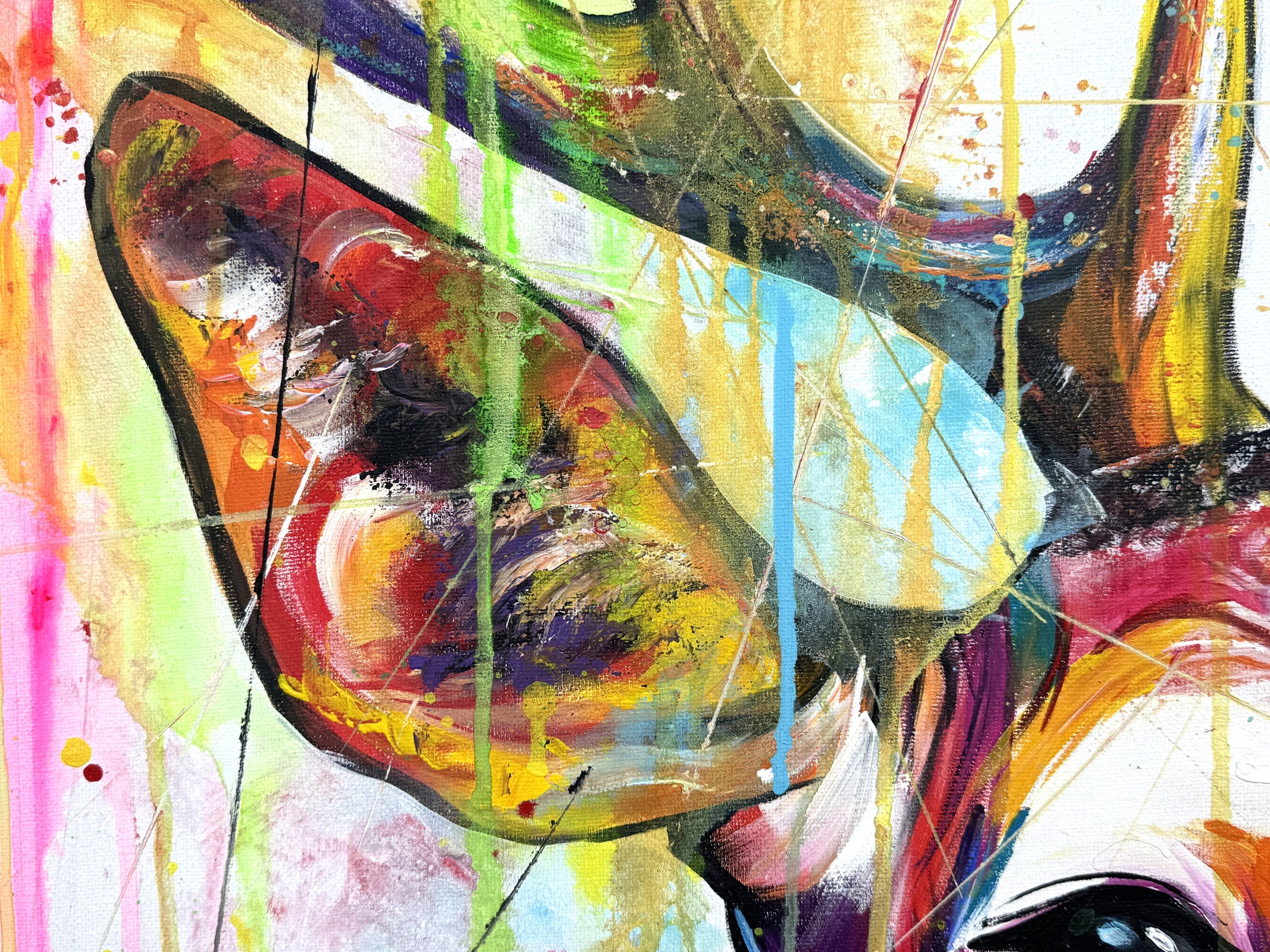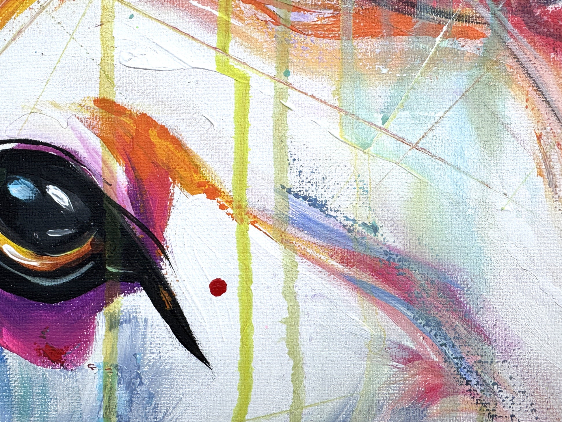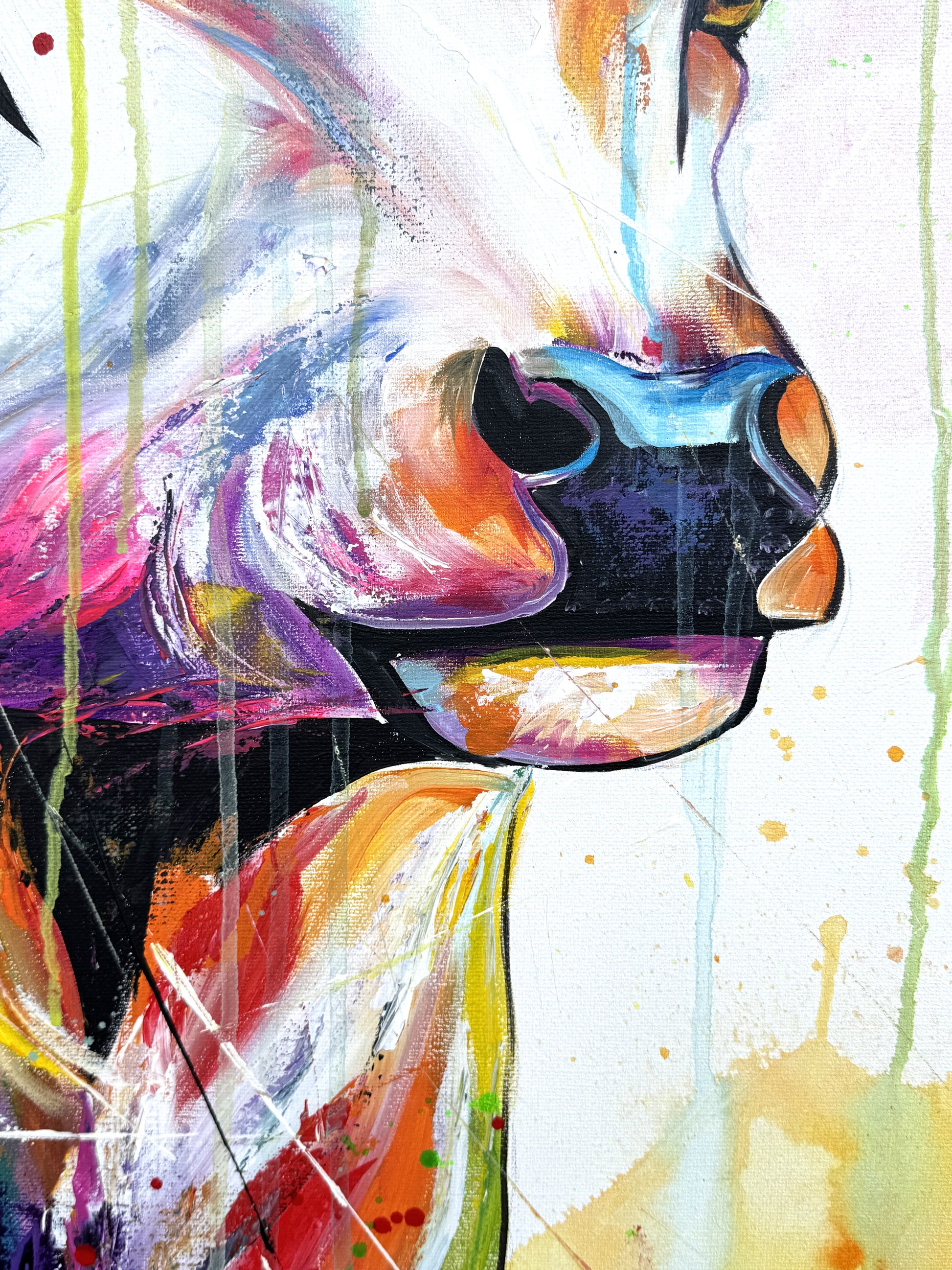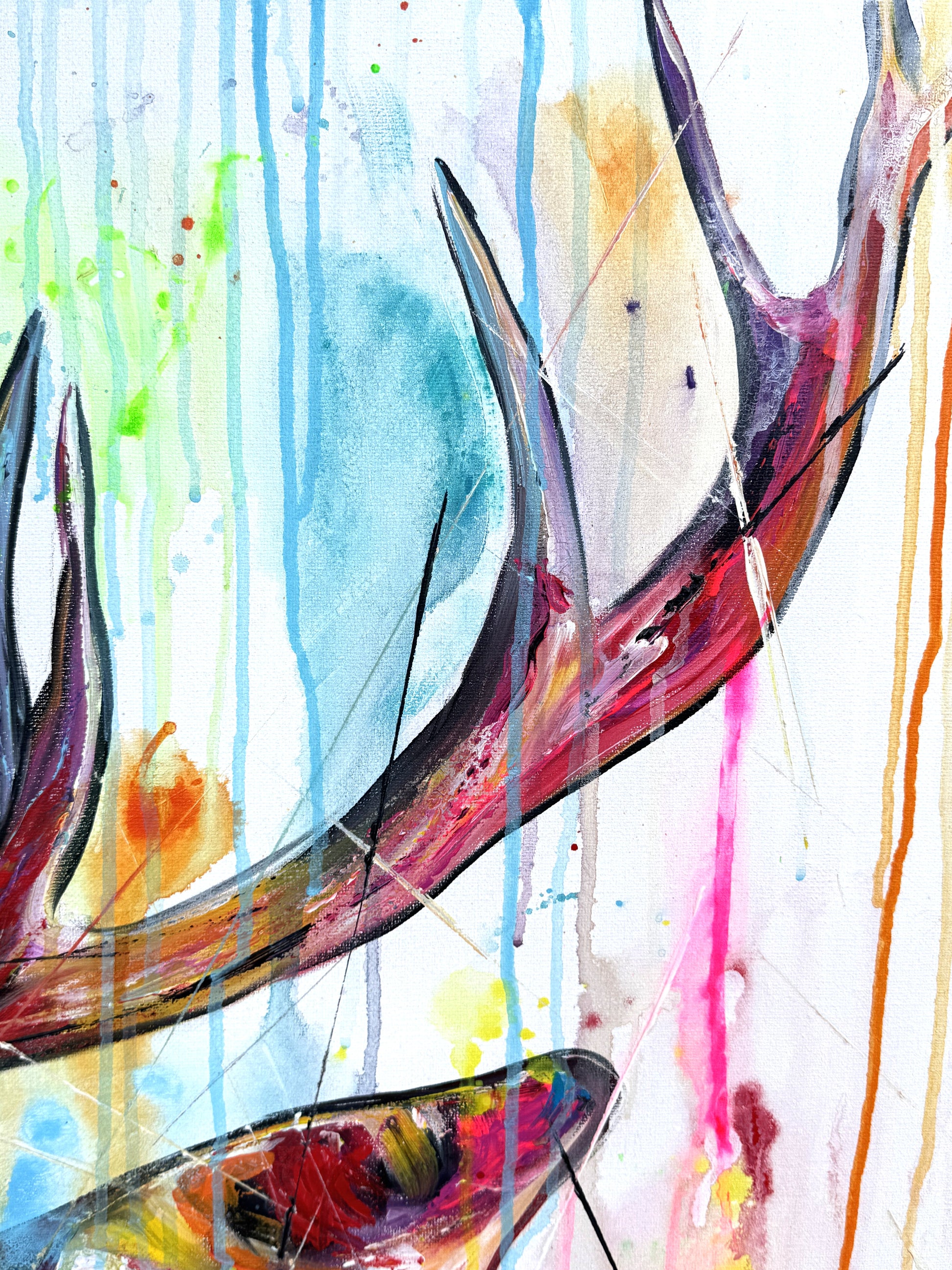 Der weiße Hirsch ist so selten wie ein Einhorn. In Deutschland gibt es schätzungsweise gerade mal 25 Exemplare. Als ich eines Tages über die Autobahn fuhr und ich meinen Blick schweifen ließ, sah ich auf der linken Seite im Feld eine Herde Rehe. Und ich hatte dass unfassbare Glück zu sehen, dass davon 2 weiß waren. Ich traute meinen Augen nicht und schaute nochmal zurück. Ich war so perplex, dass ich mir erst einredete, es könnten Alpakas gewesen sein. Aber ich habe sie vor meinem geisteigen Auge. Es waren tatsächlich 2 weiße Rehe. Ich fühlte mich gesegnet, sie gesehen zu haben und fühlte mich sofort inspiriert, einen weißen Hirsch zu malen. Die kräftigen Farbtropfen und energetischen Striche spiegeln die Freiheit und den Geist der Natur wider. Sie sollen die Einzigartigkeit, das Besondere erkennen lassen. Diese Darstellung soll einen Hauch von Wildheit und Inspiration in jedes Zuhause bringen, das sie ziert, und stets an die Schönheit des Ungezähmten und Seltenen erinnern.