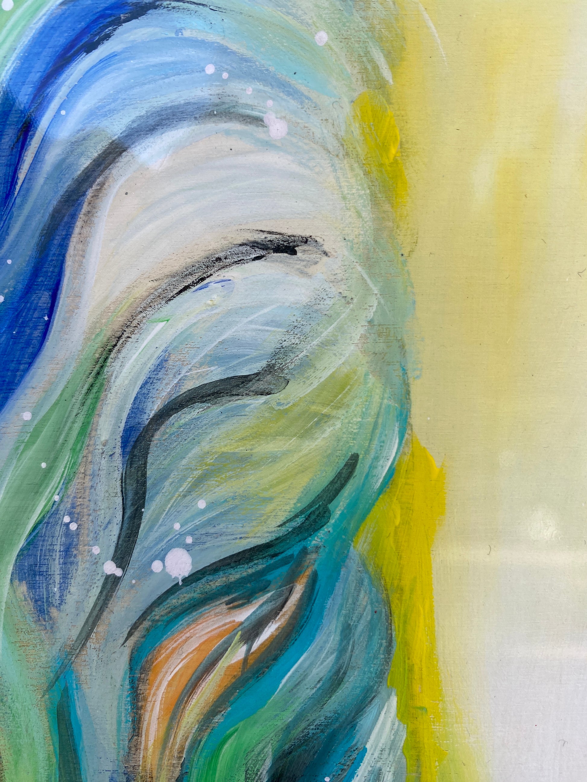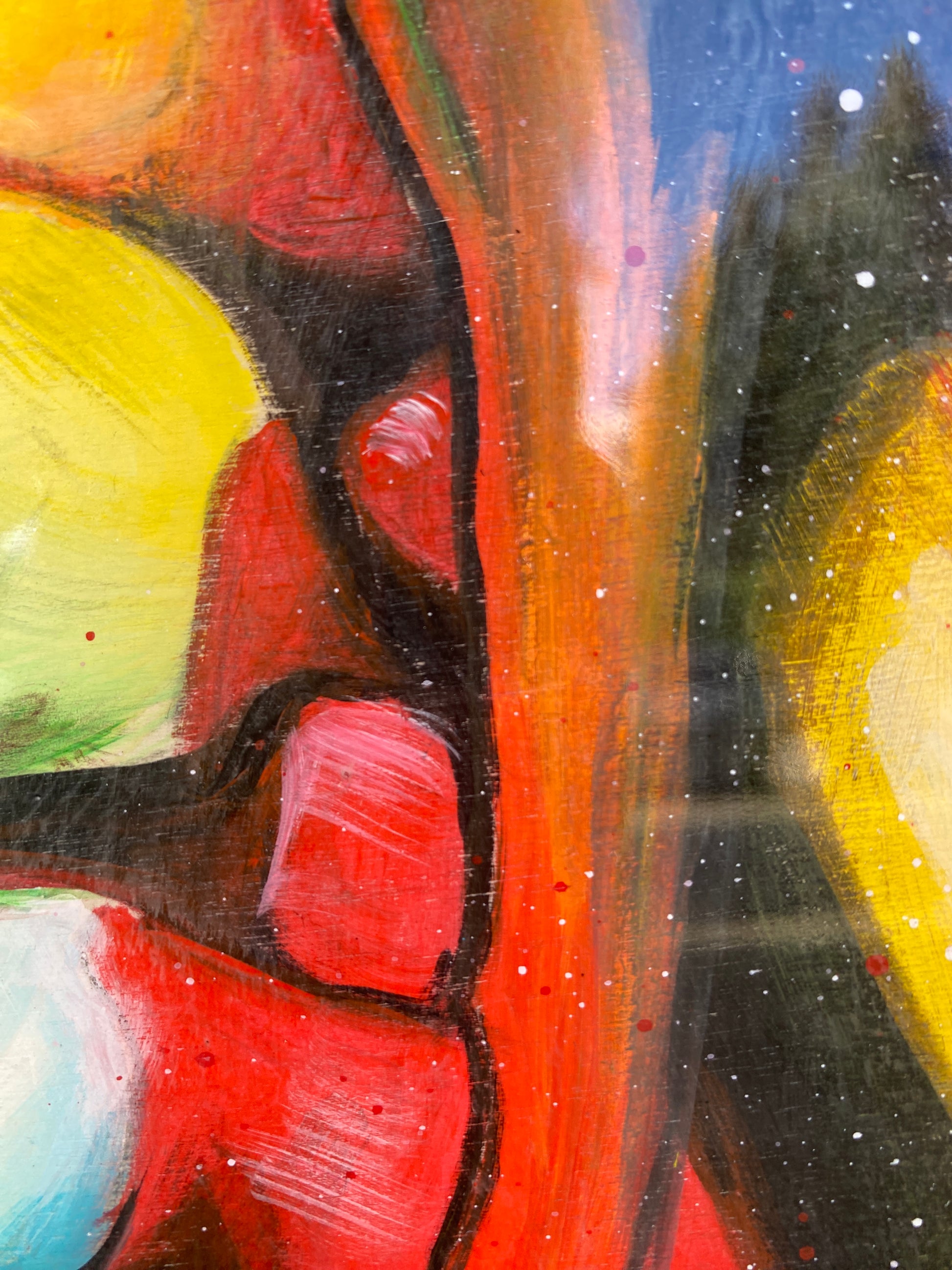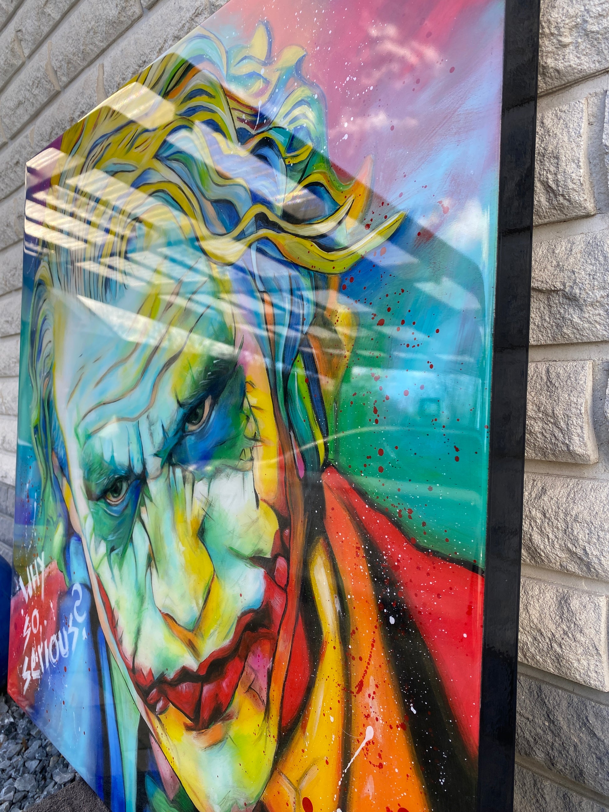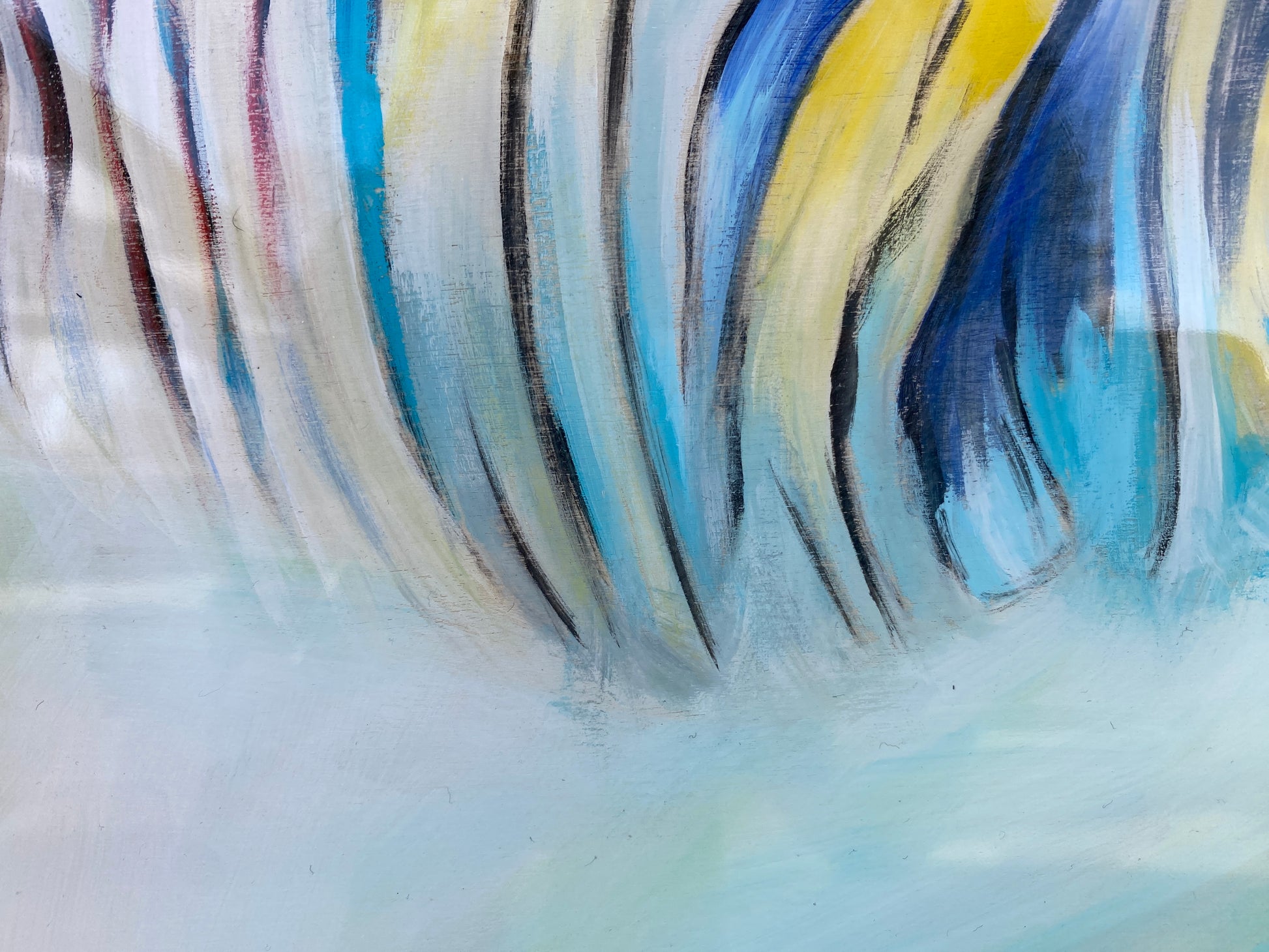 Gemalt wurde mit Acryl auf einer Holzleinwand. Diese besteht zu 100 % aus Holz und ist aufgebaut wie eine Leinwand, die auf einem Keilrahmen aufgezogen ist.
