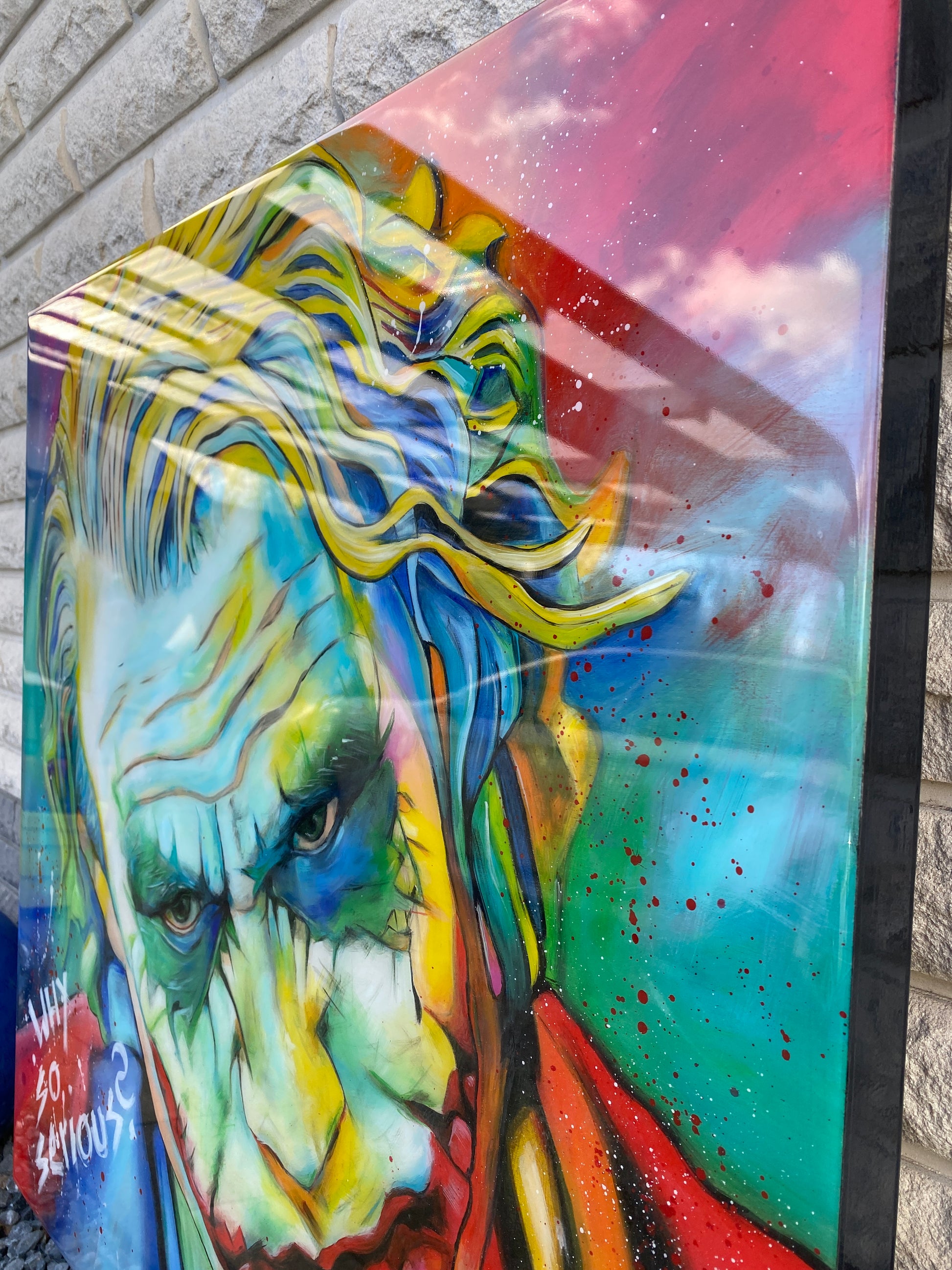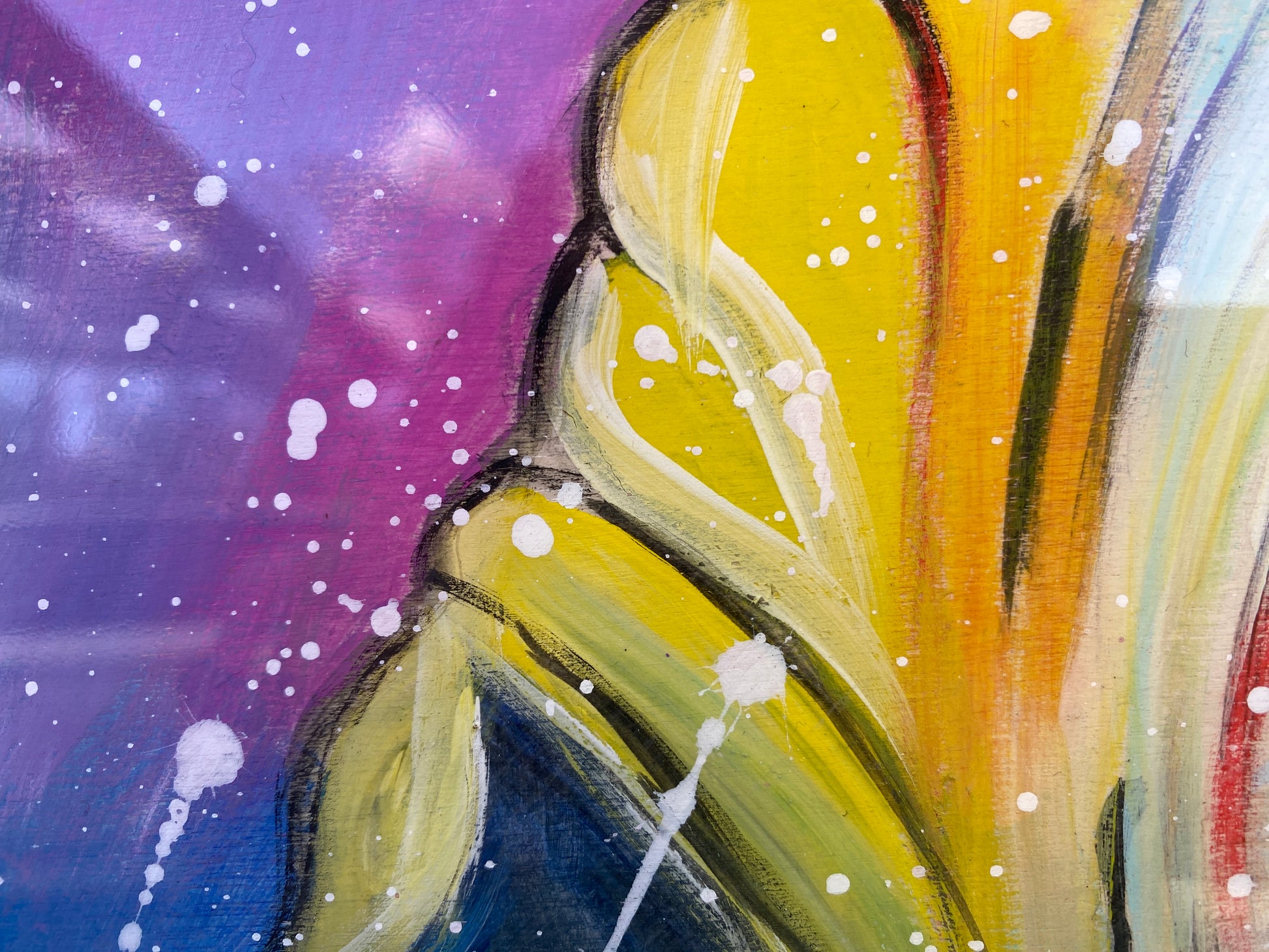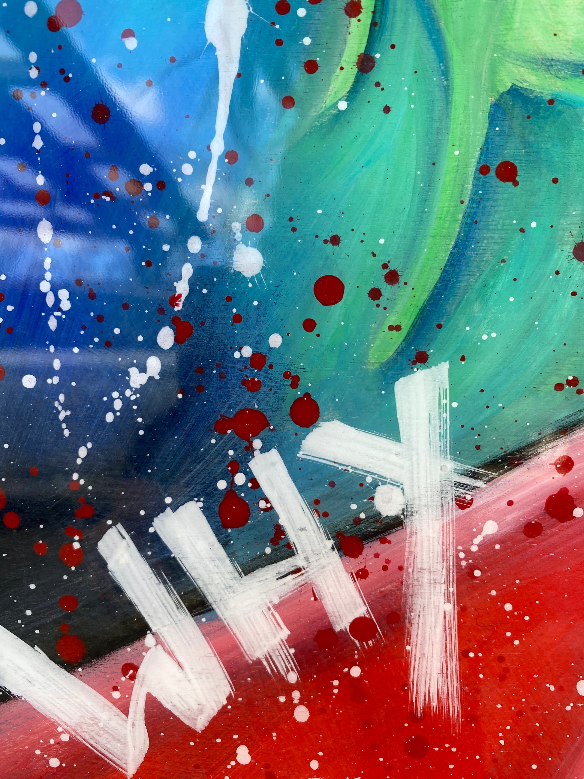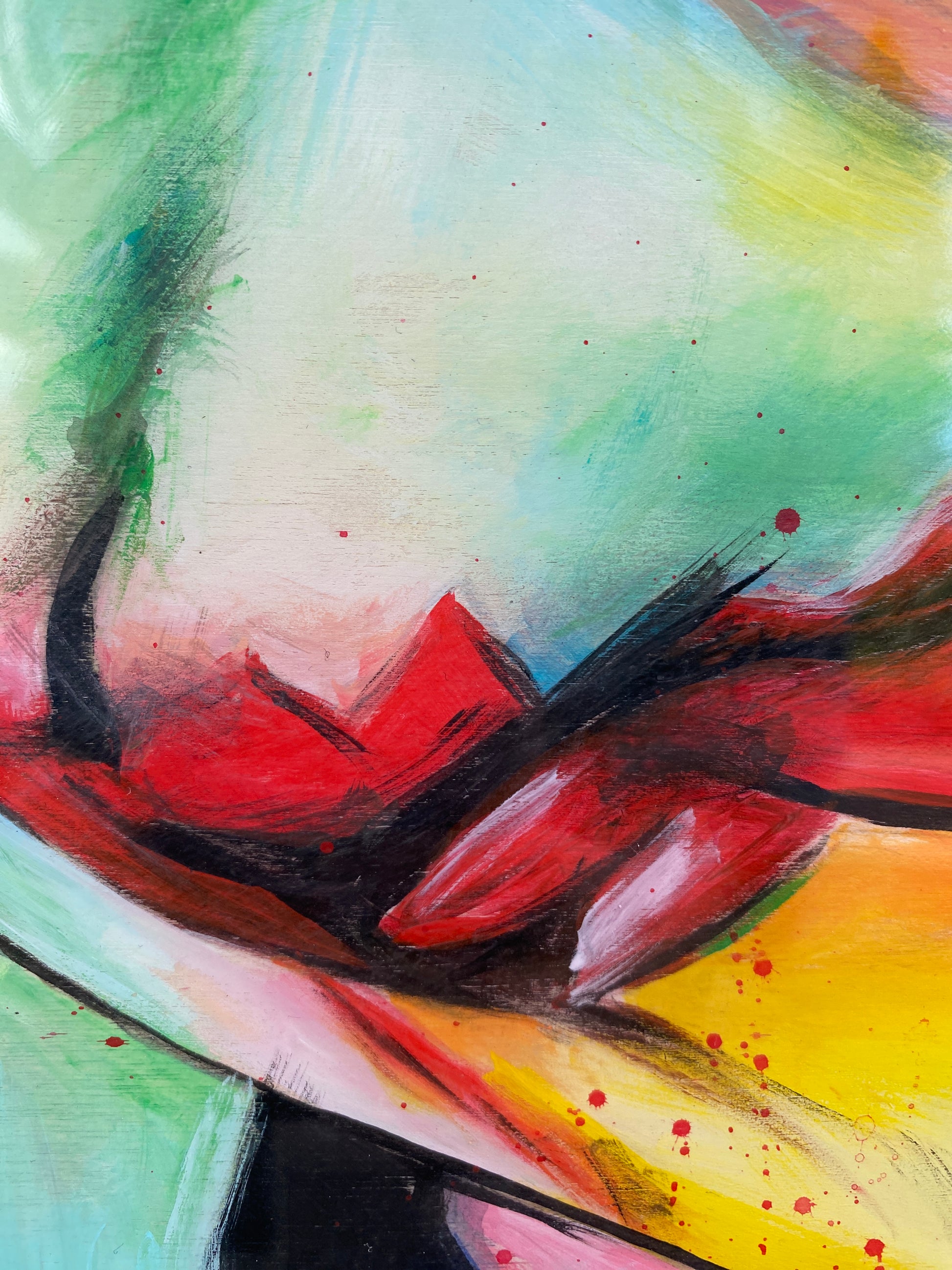 Gemalt wurde mit Acryl auf einer Holzleinwand. Diese besteht zu 100 % aus Holz und ist aufgebaut wie eine Leinwand, die auf einem Keilrahmen aufgezogen ist.