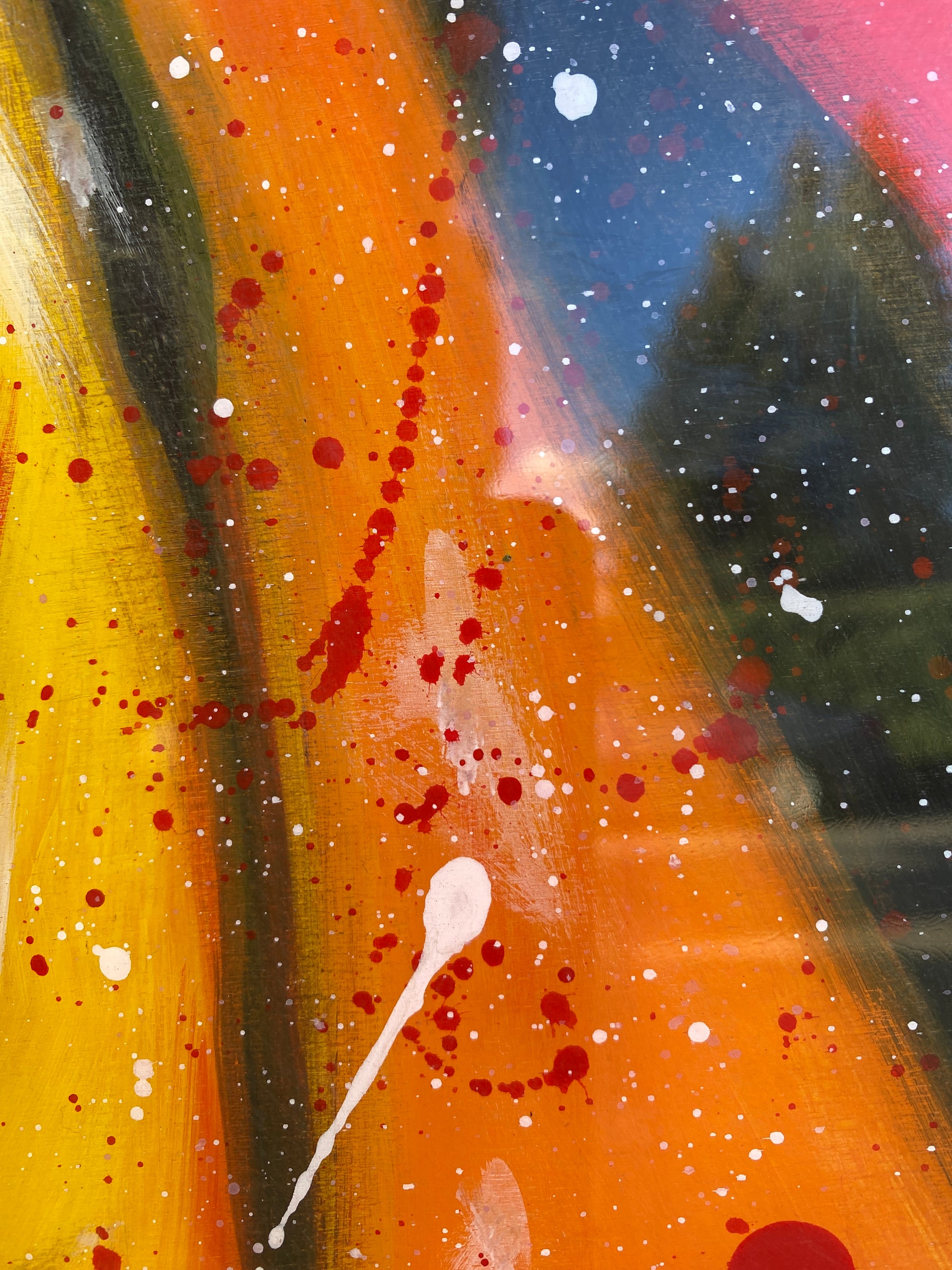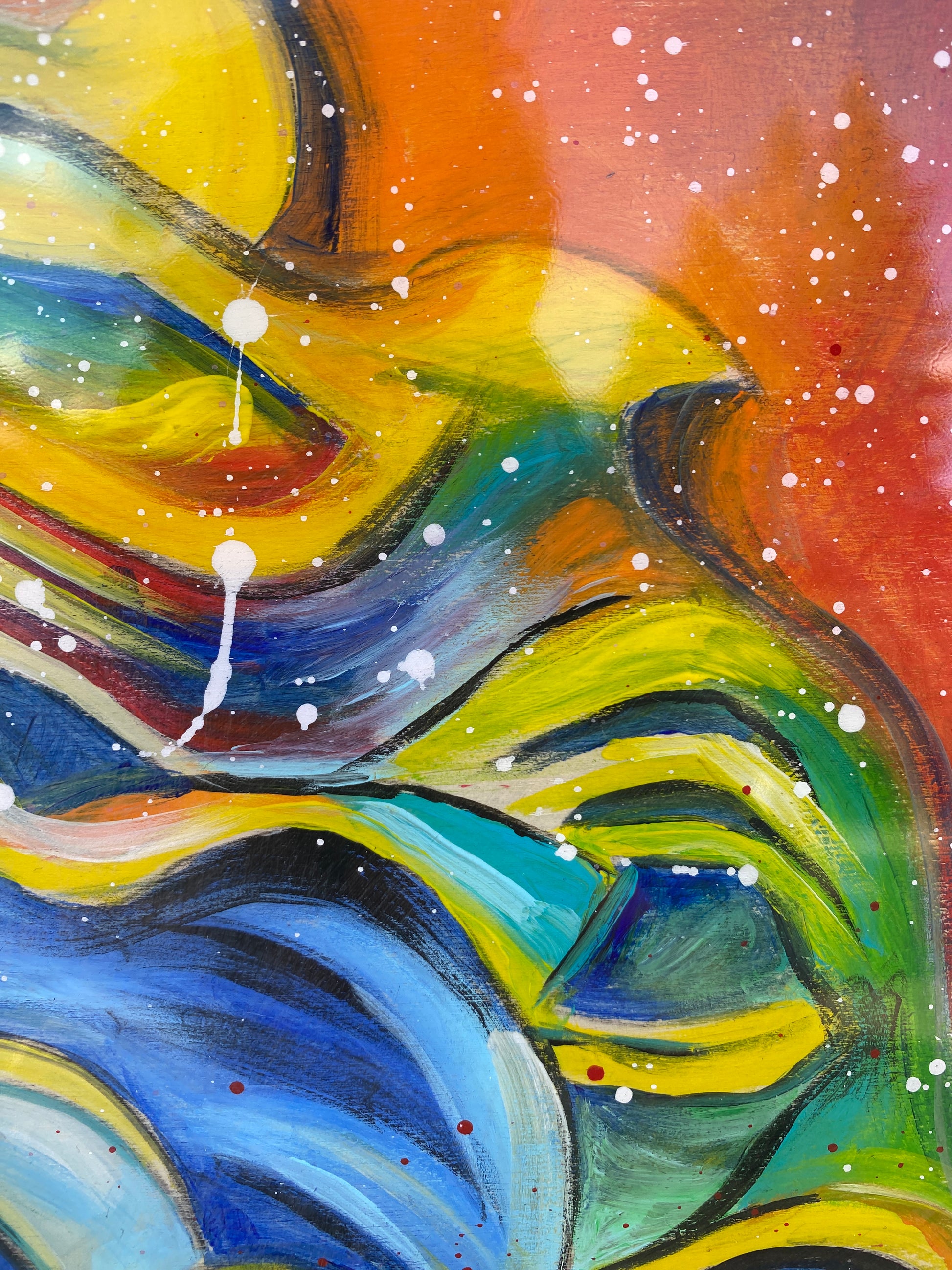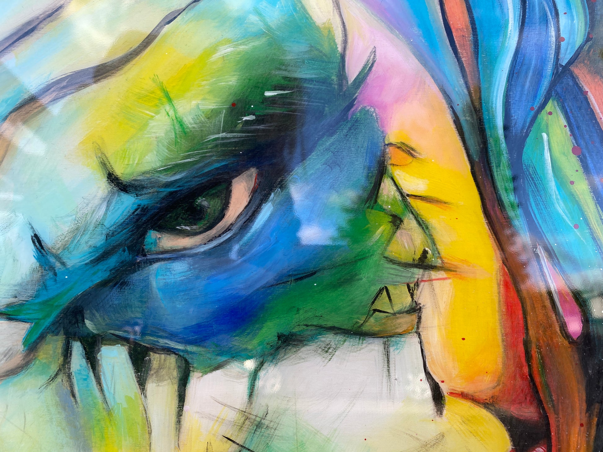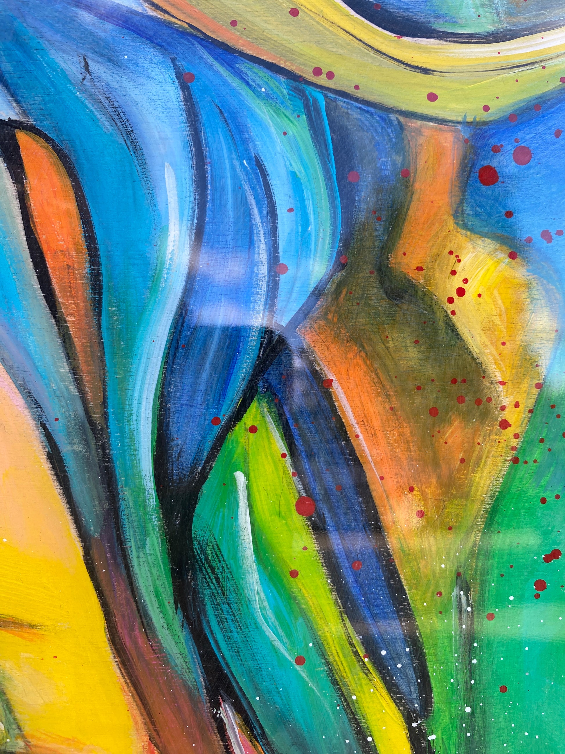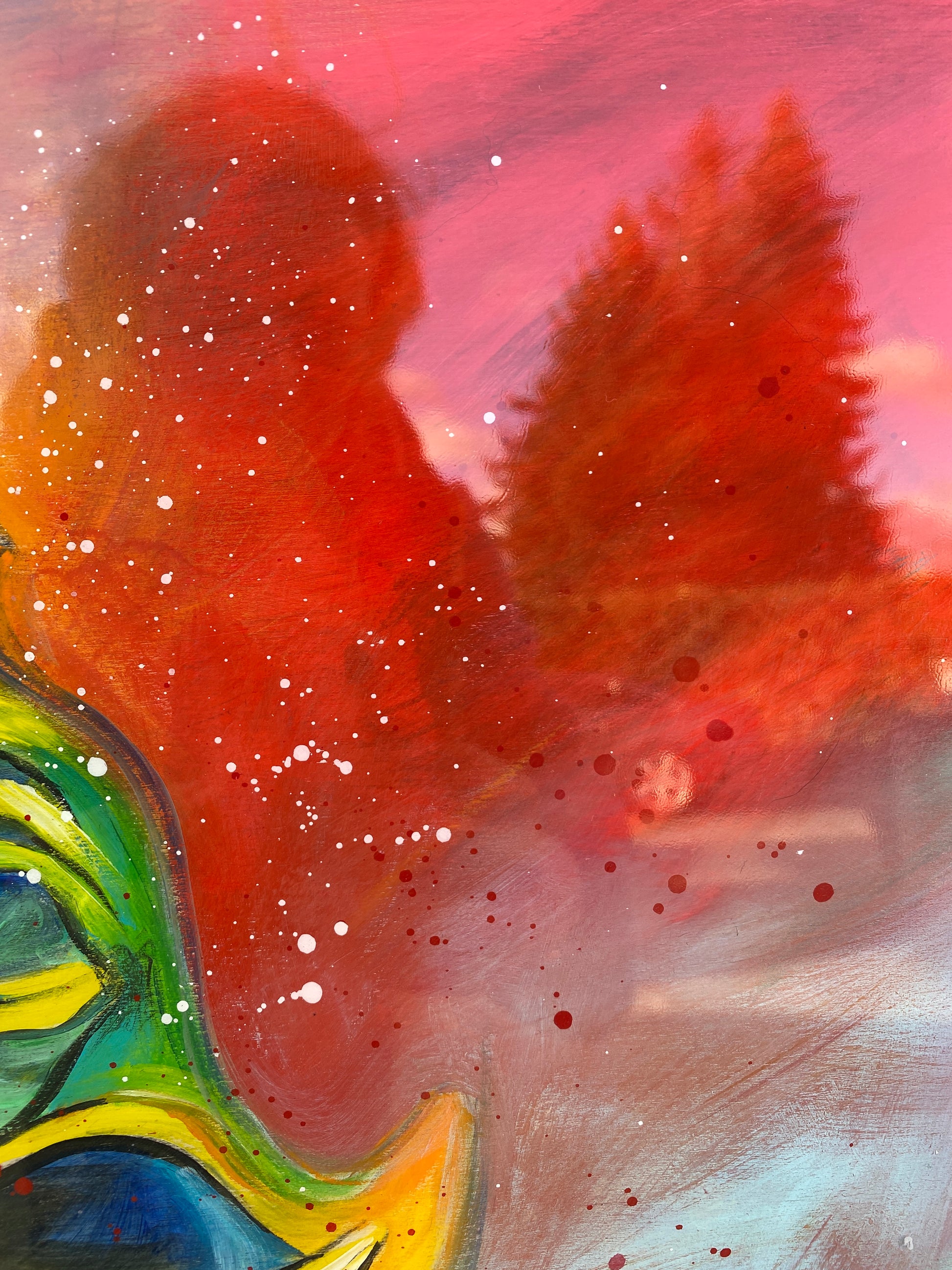 Gemalt wurde mit Acryl auf einer Holzleinwand. Diese besteht zu 100 % aus Holz und ist aufgebaut wie eine Leinwand, die auf einem Keilrahmen aufgezogen ist.